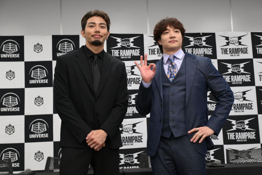 入団が決まった武知は「昨年リングに立たせていただいたときから、もっとやりたいという気持ちだったり、それをTHE RAMPAGEに持ち帰ったときにステージ上での輝き方がまた違ったりとか。感じることを違うフィールドで消化できたり、それを感じることでまた違うフィールドで消化できたり、相乗効果を感じて、どっちのリング、どっちのステージにも立ちたいという思いが強くなっていくなかで、2戦目、3戦目とやっていったんですけど。やっぱりもっと頑張りたい、でもどうしたらいいか分からないというときに、こういう話をいただきまして、会社とも相談してこういう形になりました。(ケガを)心配される方もいらっしゃると思いますし、ステージに立てないようなことになるんじゃないかと思う方もいらっしゃると思うんですけど、初めての挑戦にはリスクも伴って来ると思っています。それをはねのけるのは僕しかいないですし、僕が証明し続けることで、皆さんの不安だったりをはねのけられると思います。皆さんの期待に応えられるよう頑張ります。プロレスラーとしてはまだまだ新人なので、プロレスファンの皆さんに認めてもらえるよう、引き続き頑張っていきたいと思います」と決意表明。