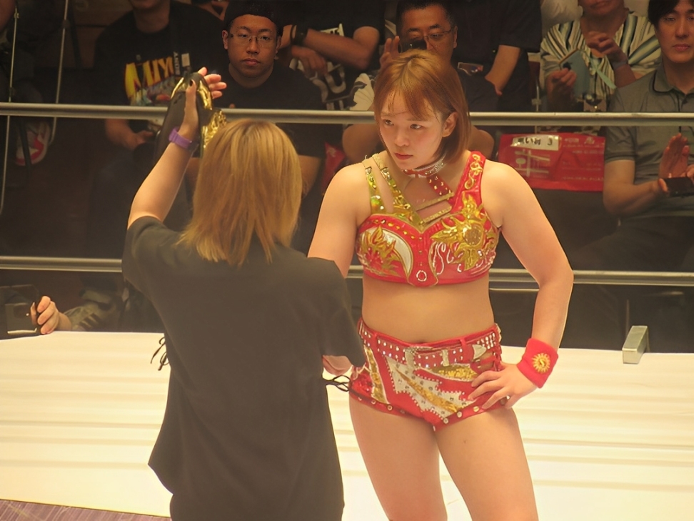 4・27横浜アリーナで朱里が岩谷麻優を下し、同王座戴冠を果たしたのを見届けたSareeeは初防衛戦での挑戦を表明し、朱里も受諾した。5・11後楽園に来場したSareeeは6・21代々木で行なわれるビッグマッチでの挑戦を迫るも、6月6日(現地時間)、英国の女子プロレス団体EVEのロンドン大会でアレックス・ウィンザーがチャレンジすることが電撃決定しまう。“初”防衛戦でないことにSareeeは「約束を守れない」と激怒も、朱里は「6月6日、防衛してくるから」となだめて、その場を収めた。そして、朱里は6日のロンドン大会で、東京女子プロレスのインターナショナル・プリンセス王座を巻いたこともある実力者のウィンザーを破り初防衛に成功。かくして、6・21代々木での王者・朱里vs挑戦者・Sareeeの王座戦がようやく正式に決まった。