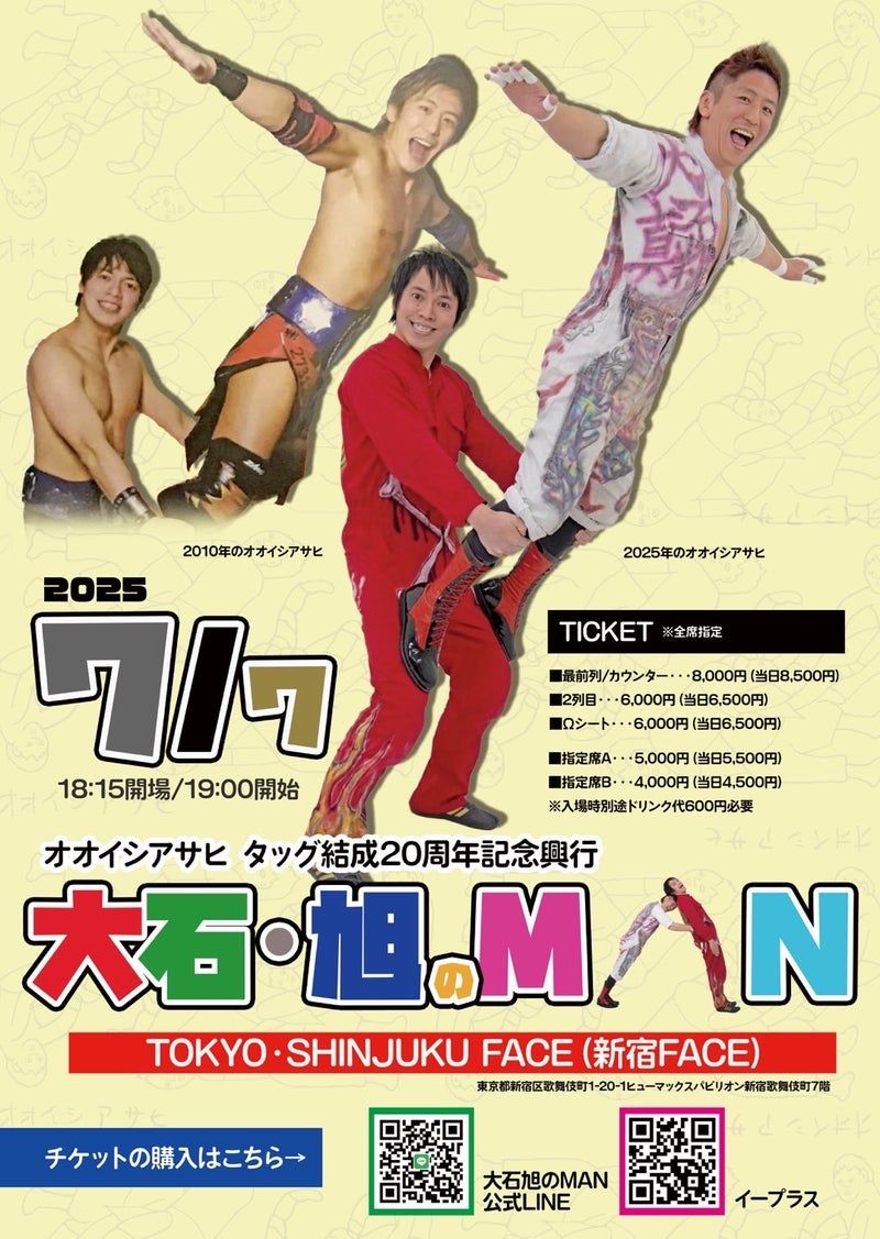 プロレス界に歴史を刻んできた異色のタッグ、大石真翔(フリー)と旭志織(2AW)による自主興行4部作の完結編として7月7日(月)、新宿FACEを舞台に繰り広げられる「大石旭のMAN」の全対戦カードが、ついにベールを脱いだ!