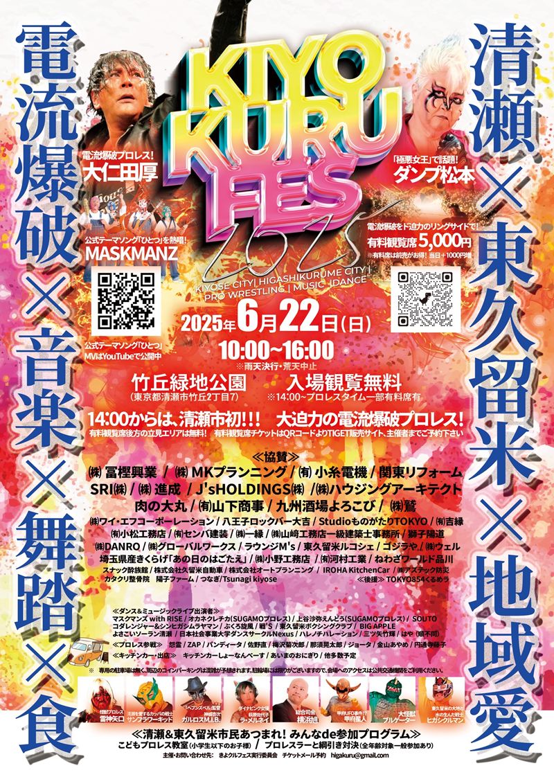 きよクルフェスは、6月22日(日)、東京都清瀬市の竹丘緑地公園で10:00開始、プロレスは14:00から試合開始となる。当日はキッチンカーや屋台も20近く出店される。入場無料。