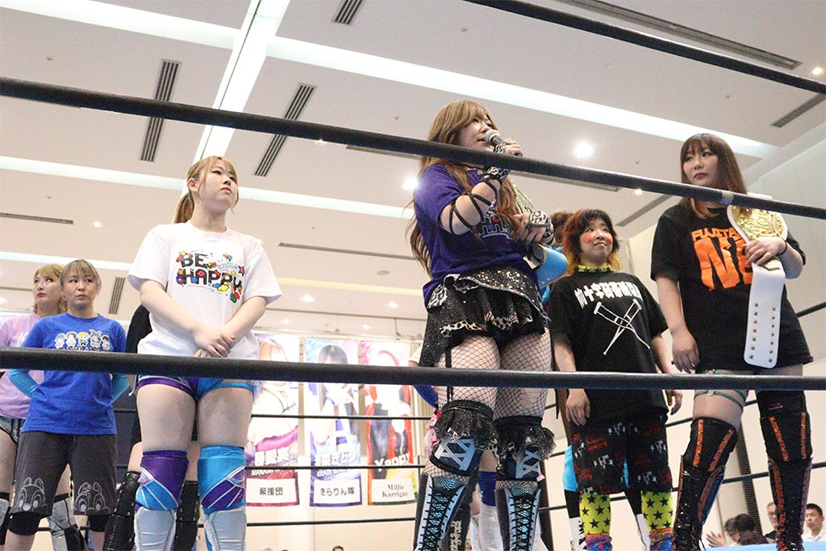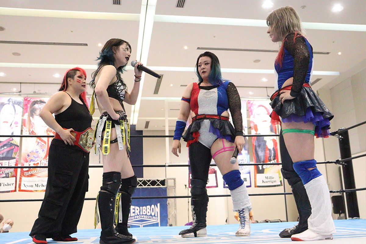 挨拶のマイクを手にしたのは勝。「6月21日、雨のちリボン、後楽園大会で4度目の防衛戦、藤田あかね相手に決まっています。今日の前哨戦が最初で最後の前哨戦になります。今日、勝てないやつはベルトを獲れないし、ベルトを守れない。私は今日、藤田あかねに直接勝ってタイトルマッチにつなげていきたいと思います。」と横に立つあかねを挑発。