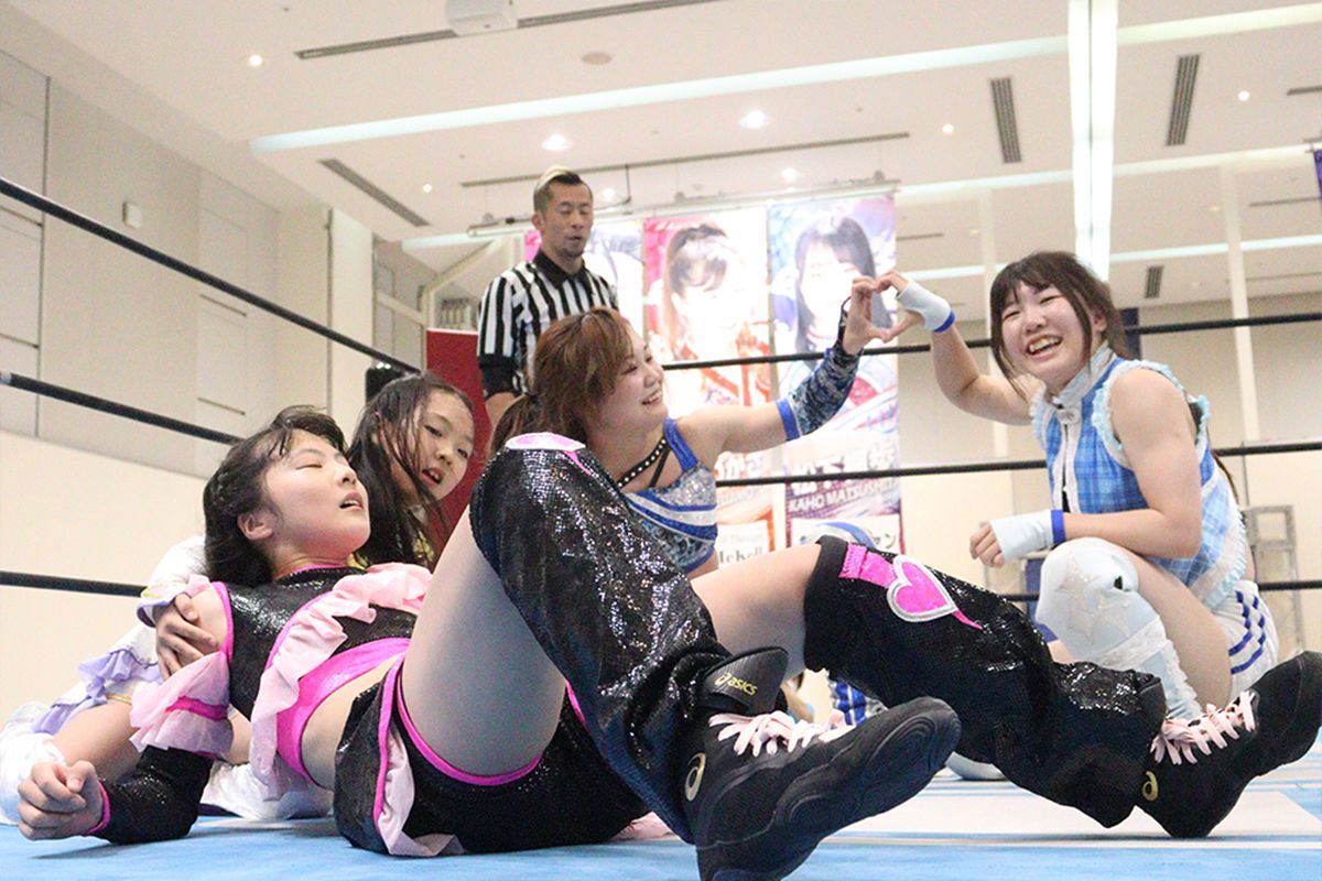 真琴がダブルアーム・スープレックスでカバーもカウント2。代わったりこがドロップキック4連発でカバーもカウント2。神姫楽がカウンターのタックル。愛梨紗とのダブルシャーからのダブル正面ドロップキック、串刺し攻撃、ダブルエルボードロップで神姫楽がカバーもカウント2。神姫楽が逆エビ固めも真琴がカット。真琴とりこが神姫楽をロープに振るが、神姫楽が真琴にカウンターの正面ドロップキック。りこを担ぎ上げるがりこが逃れてエビ固めを狙う。こらえた神姫楽がヒップドロップ。