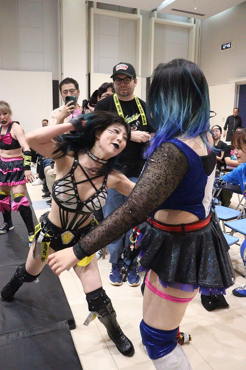 久令愛がタックルを決めロープに飛ぶが、杏ちゃむが蹴りでカット。杏ちゃむが久令愛を場外に落とし、場外戦へ。セコンドのYappyも加担する。CREAKARIがバニーをリングに戻し、ダブルのカニばさみ。久令愛がキャメルクラッチを決めAKARIが顔面ドロップキック。バニーをロープにはりつけての顔面踏み。代わったAKARIがコーナーにバニーを詰めて踏みつけ、ロープの間に寝ころんでの踏みつけでカバーもカウント2。