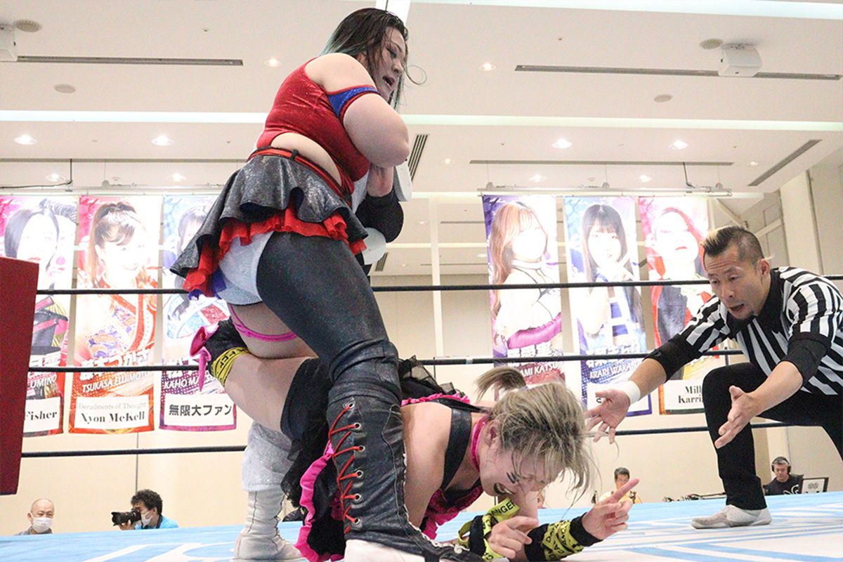 愛梨紗が河津落とし、フットスタンプでカバーもカウント2。代わった神姫楽が愛梨紗を呼び込みダブルのタックル、正面ドロップキック。真琴がカウンターのトラースキック。2発目の真琴の蹴りをキャッチした神姫楽が膝にエルボー。さらに神姫楽がエルボー連打も真琴が膝蹴り、かかと落とし、ダブルニードロップでカバーもカウント2。真琴がファイヤーマンズキャリーもバックに逃れた神姫楽がコーナーに真琴を振り串刺しスピアー、コーナーに上がってのミサロックからの丸め込みもカウントは2。