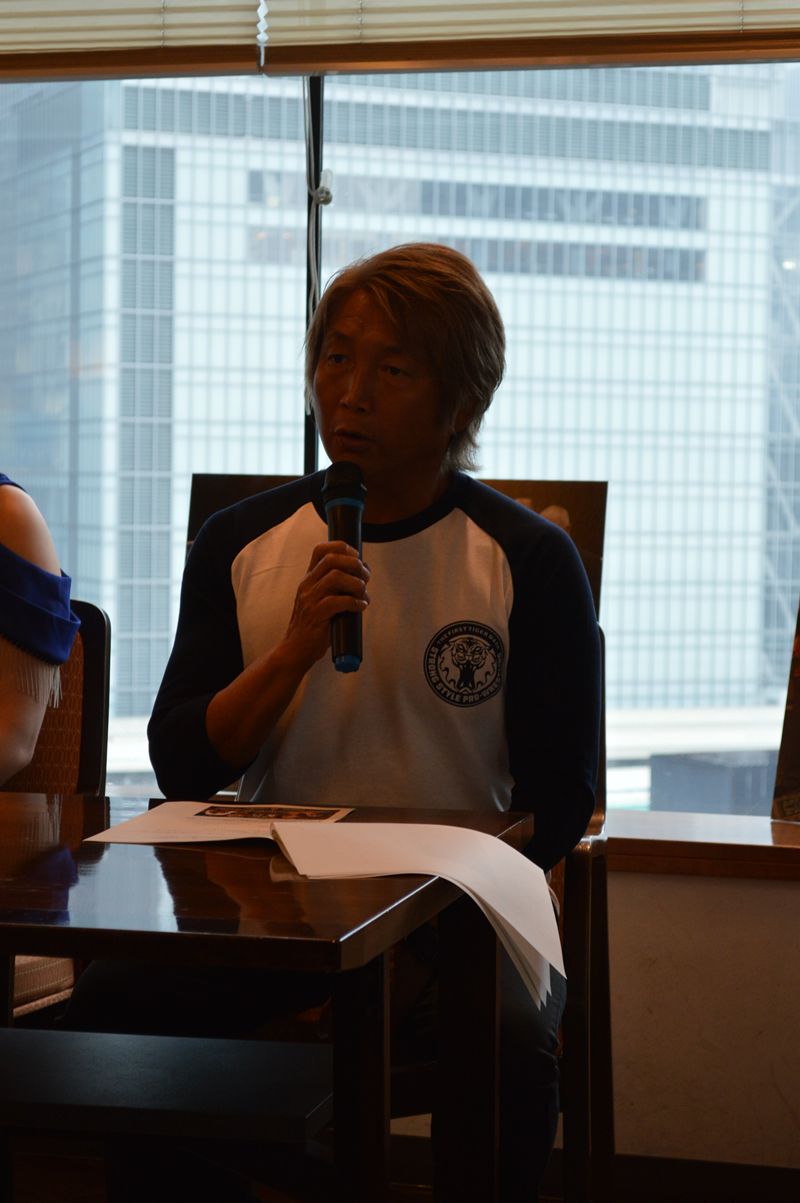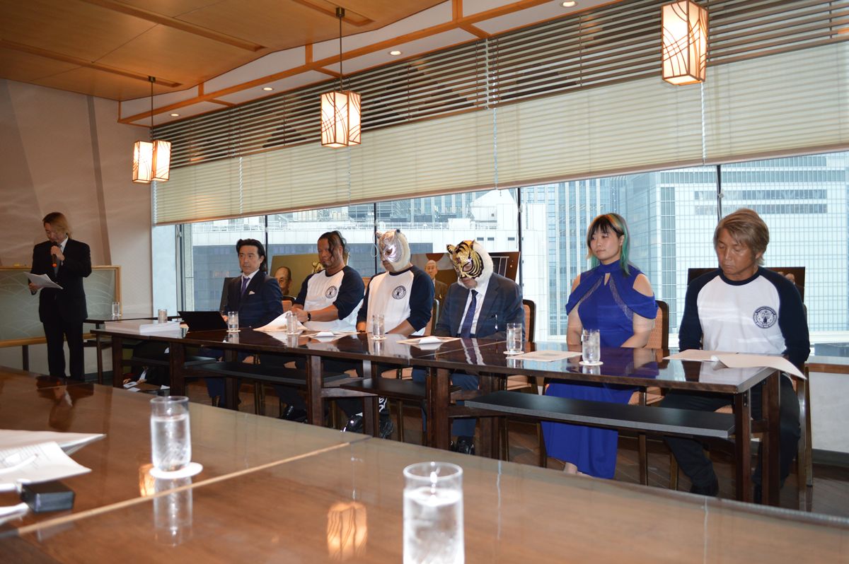 平井丈雅代表「みなさま、本日は初代タイガーマスクストロングスタイルプロレスの記者会見にお越しいただき、誠にありがとうございます。アントニオ猪木会長を長年お支えされ、初代タイガーマスクを生みだした過激な仕掛人、新間寿会長がご逝去されました。新間会長のご葬儀に際しまして、みなさまにご参列いただきまして衷心より感謝いたします。新間会長の思い、佐山サトル総監の思い、その思いを今回の大会に紡いでいきたいと思います。本追悼大会は、今朝、全カードを発表させていただき、新間会長にゆかりのある選手にご参戦いただきカードを編成させていただきました。新日本プロレスで初代タイガーマスク佐山サトル総監をはじめ、多くのレスラーの皆さまを支え、UWFを設立、そしてユニバーサルプロレスリングを設立、多くのレスラーを生み出し、それらに関わった方々をお呼びいたしました。そして、現在女子プロレスで輝きを放っておりますマリーゴールドのMIRAI選手。もともと新間会長、佐山総監率いるストロングスタイルプロレスと狭山総監の故郷、山口県下関市が共同開催した2012年5月の巌流島大会。その大会に新間会長がMIRAIちゃん親子を招待し、そこで佐山総監の試合を見てプロレスラーになることを決心されたMIRAIちゃんが2019年にデビューをされ、いまプロレス界で大活躍をされております。そのMIRAIちゃんに本日来ていただきました。佐山総監の弟子、新間会長も愛してくださったスーパー・タイガー、間下隼人、日高郁人コーチ、サスケ会長、現レジェンド王者船木誠勝選手、そして、藤波辰爾社長、ジャガー横田選手、Sareee選手他、多くの選手がこの大会で新間会長を思ってファイトされることになります。よろしくお願いいたします」