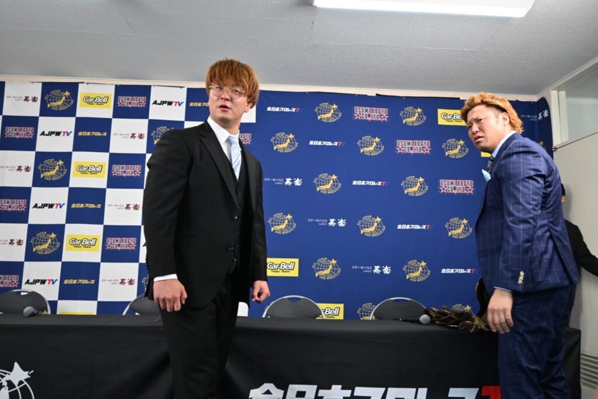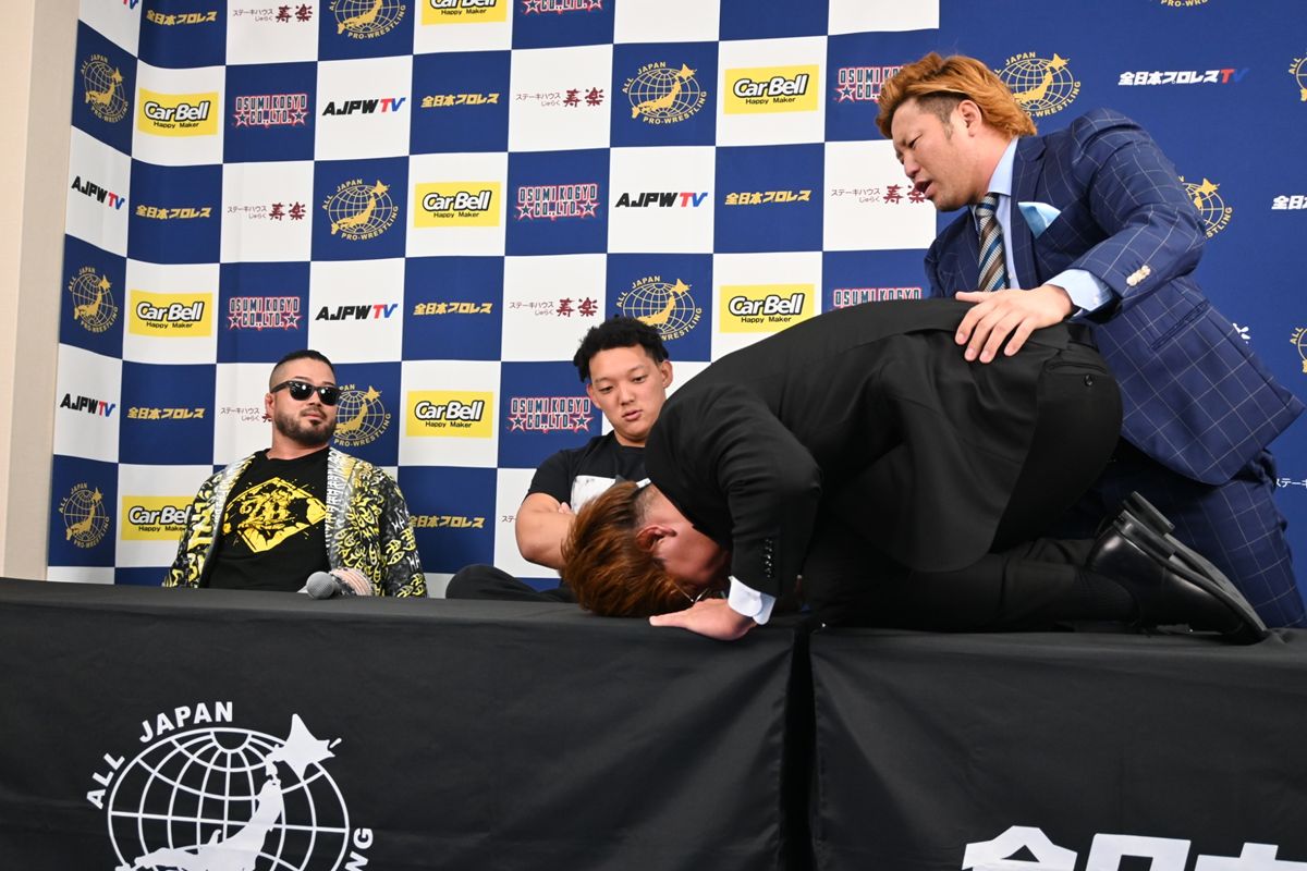 挑戦を迫る会見はもはや「土下座劇場」と化し、主役はすっかり青柳に。「お前はやらなくていいんだよ!」と宮原が何度も止めるも、「やらないと進まないらしいんで」「全日本プロレスのために土下座を」と突き進む青柳に、王者チームの行方には不安が漂う。