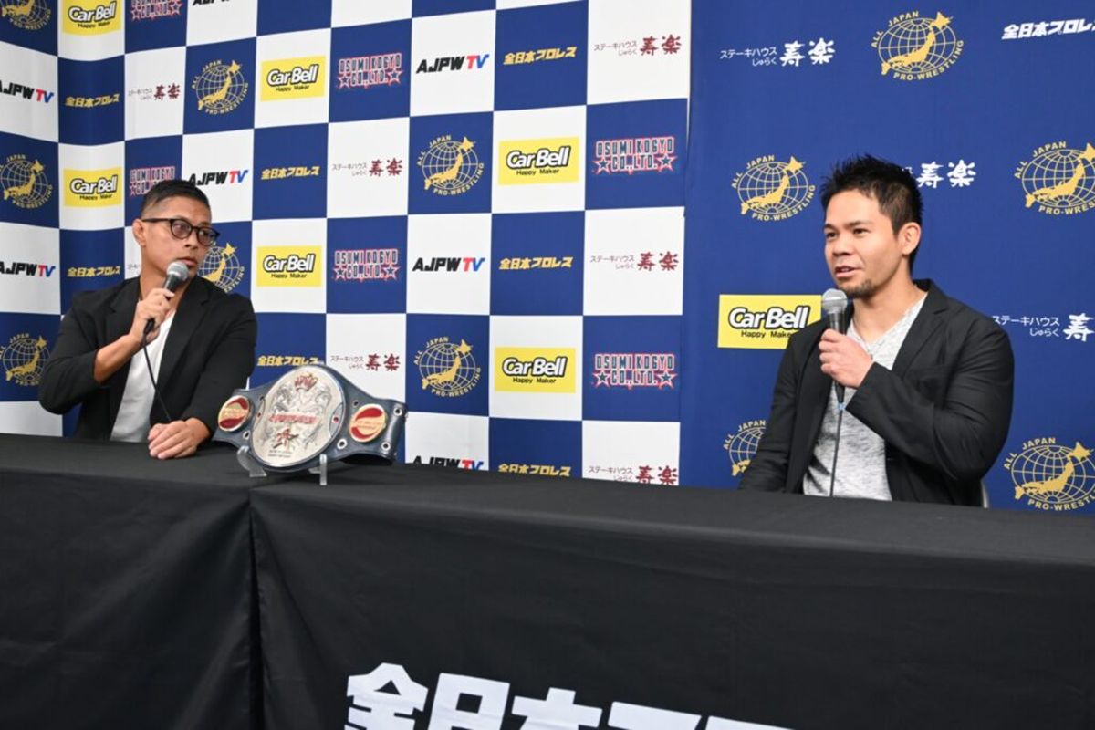 全日本プロレスは6月18日(水)後楽園ホール大会にて行われる「世界ジュニアヘビー級選手権試合」に向け、王者・吉岡世起と挑戦者・“ミスター斉藤”土井成樹による記者会見を開催。昨年の苫小牧大会以来となる両者のタイトル戦が、今再び動き出す。