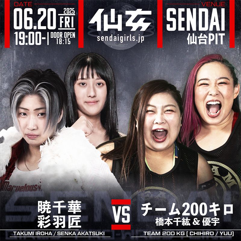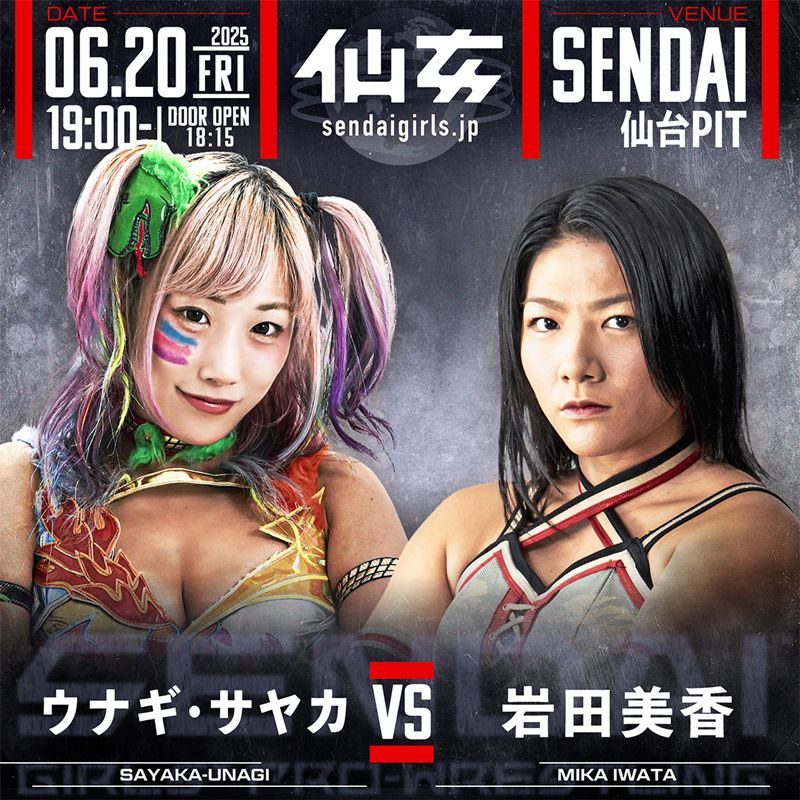 センダイガールズプロレスリングは、6月20日(金)仙台PIT大会の全対戦カードを発表した。注目のセミファイナルでは、フリー参戦中のウナギ・サヤカと岩田美香がついにシングルマッチで激突。さらに、センダイガールズワールドジュニア選手権試合では、王者・さくらあやにYUNAが挑戦する。