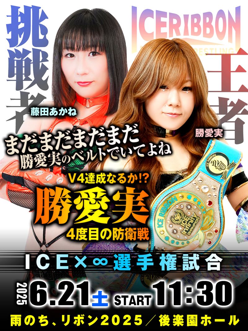 女子プロレス団体アイスリボンは6月21日(土)後楽園ホール大会「雨のち、リボン2025」の全対戦カードを発表した。メインイベントでは、ICE×∞選手権試合が組まれ、王者・勝愛実が挑戦者・藤田あかねを迎え撃つ4度目の防衛戦に挑む。両者は7日の蒲田大会で最初で最後となる前哨戦を激しく闘い抜き、後楽園決戦へ向け火花を散らした。
