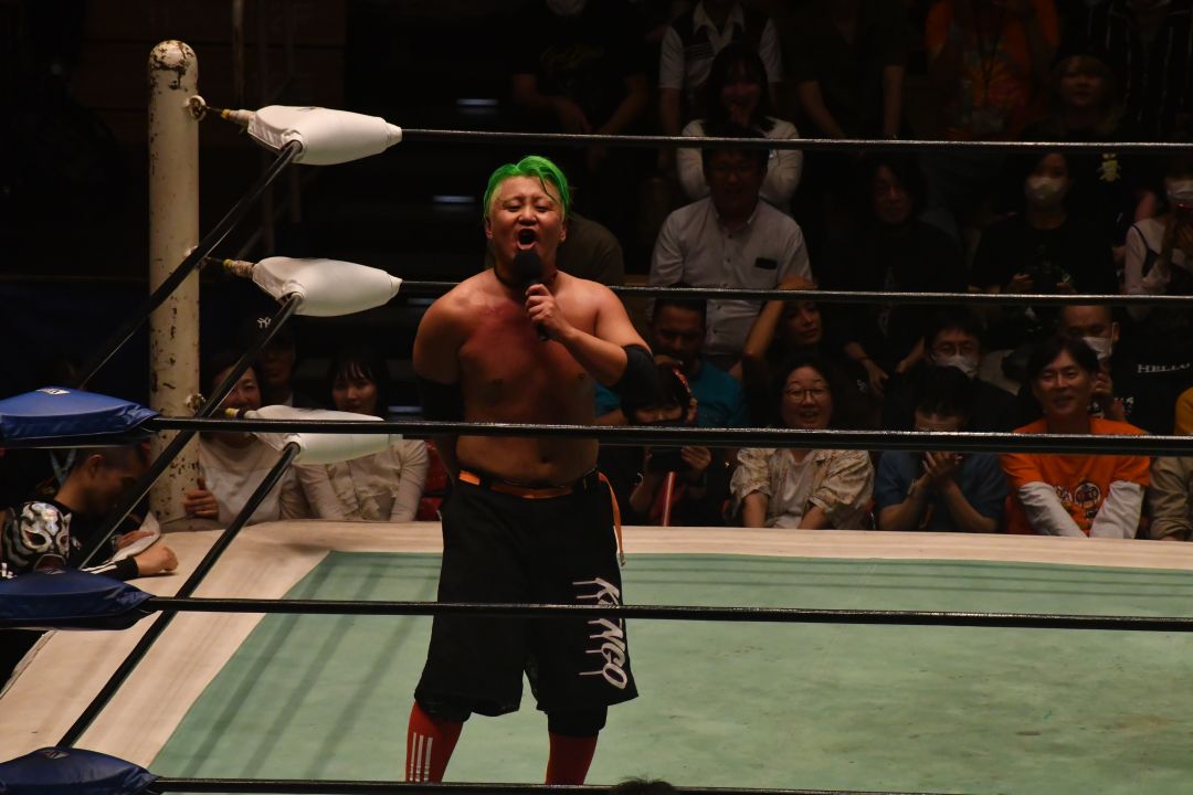 敗れた拳剛はマイクでヒロムとライブハウスで会うという関係性を話すと「ヒロム、今日は言いたい事があって握手を拒否したわけじゃないんだ。今日ヒロムとぶつかった、最高の楽しかったです。これはマジで、ほんまに心の底からありがとうと思ってます。今日は闘った。次はタッグを組んで、東北タッグ取りにいきますか?」と提案すると歓声が起こる。