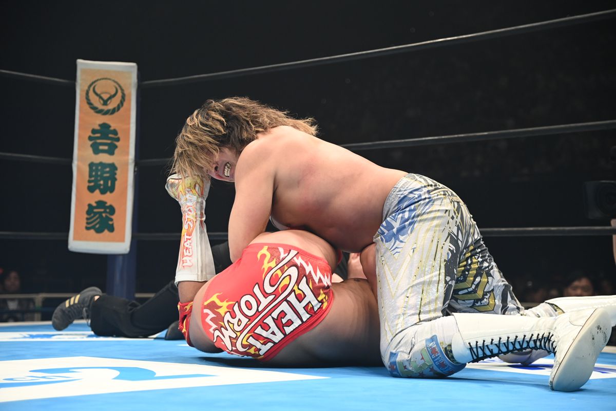 試合はロックアップから始まるオーソドックスな立ち上がりを見せたが、すぐさま互いの意地がむき出しとなる。上村はアームドラッグから主導権を握り、棚橋の左腕に集中攻撃を展開。低空ドロップキックからアームブリーカー、さらにはキーロックと流れるような連携で攻め立てた。