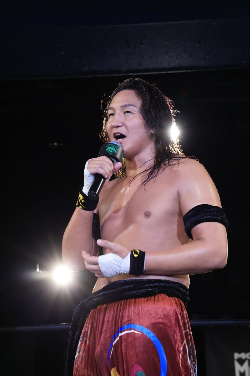 「負けました。NOAHとか初参戦だし、初めてのリングに初めての相手っていうのは、日頃にない刺激をすごい感じて。悔しいんですけど、非常にいい経験値になったなと思いますけど、負けたままでは終わらないんで。自分は必ずやり返すし、自分にはタッグもあるんで。アストロノーツでもいいし、また個人でやり返しに行ったっていいし。まあ、とにかく今日は負けたんで。ありがとうございました」