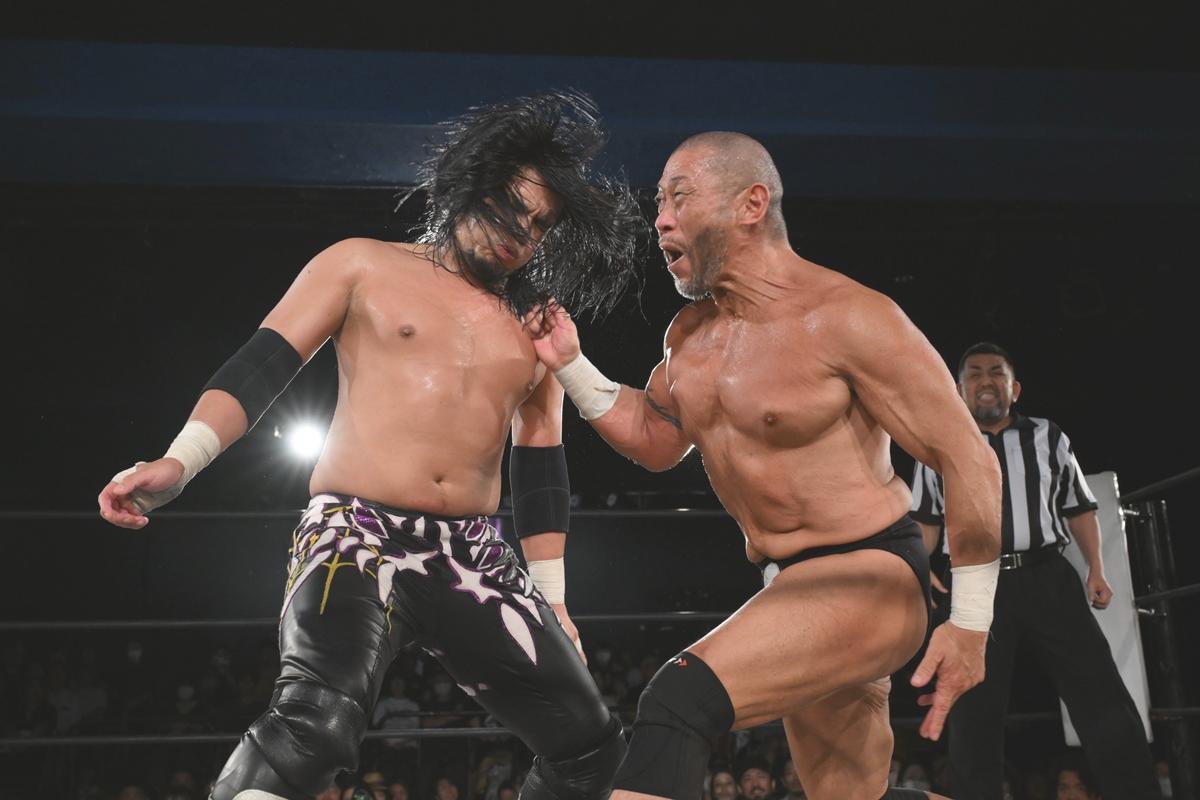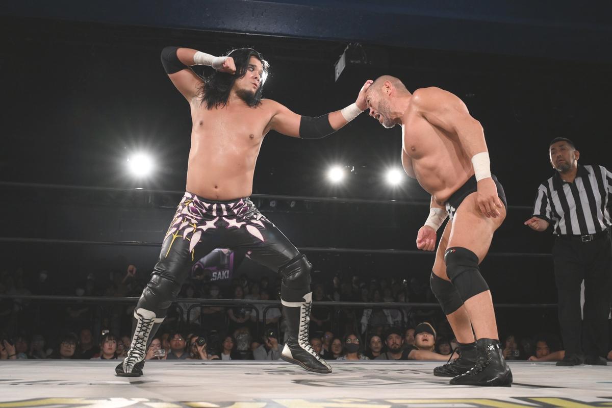 クリーンに握手で始まった師弟対決は濃密なレスリングの攻防。場外戦に転じ、リングに戻ると、佐々木は足にマトを絞っていく。東郷がクロス・フェースロックを狙えば、佐々木は同じ技で返す。東郷が再度クロス・フェースロックもエスケープ。東郷がペディグリーからトップロープに上がるも、佐々木がレフェリーを巻き込んで阻止。佐々木は場外めがけて雪崩式ブレーンバスター。カウンター席から飛び込んでダイビング・エルボードロップ。両者リングインすると、佐々木がミスティカ式クロス・フェースロック。脱出した東郷はラリアット連打。ナックルパートの応酬から、東郷がミスティカ式クロス・フェースロックもエスケープ。東郷はペディグリーからダイビング・セントーンもカウントは2。ならばと東郷は強引に引き起こすと、強烈なナックルパートを叩き込んで3カウントを奪取した。