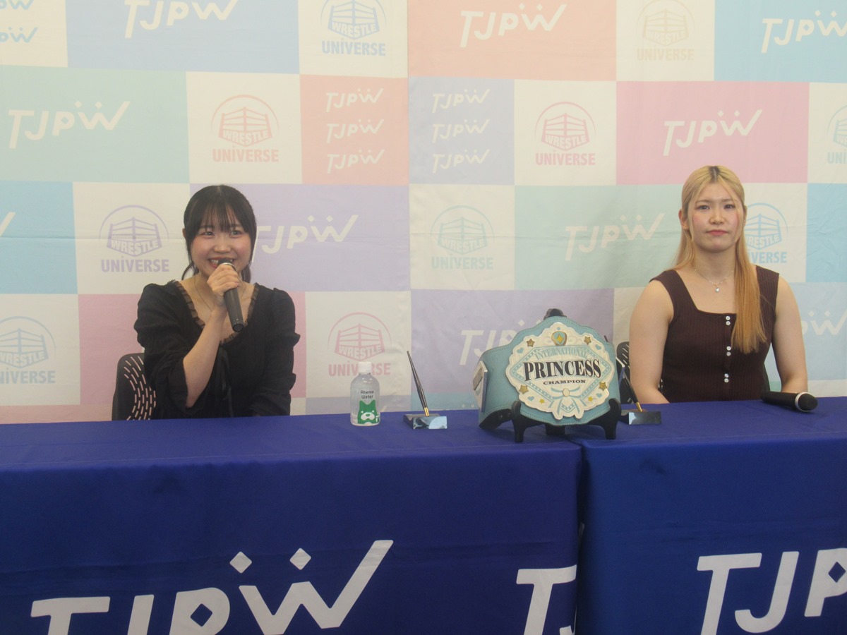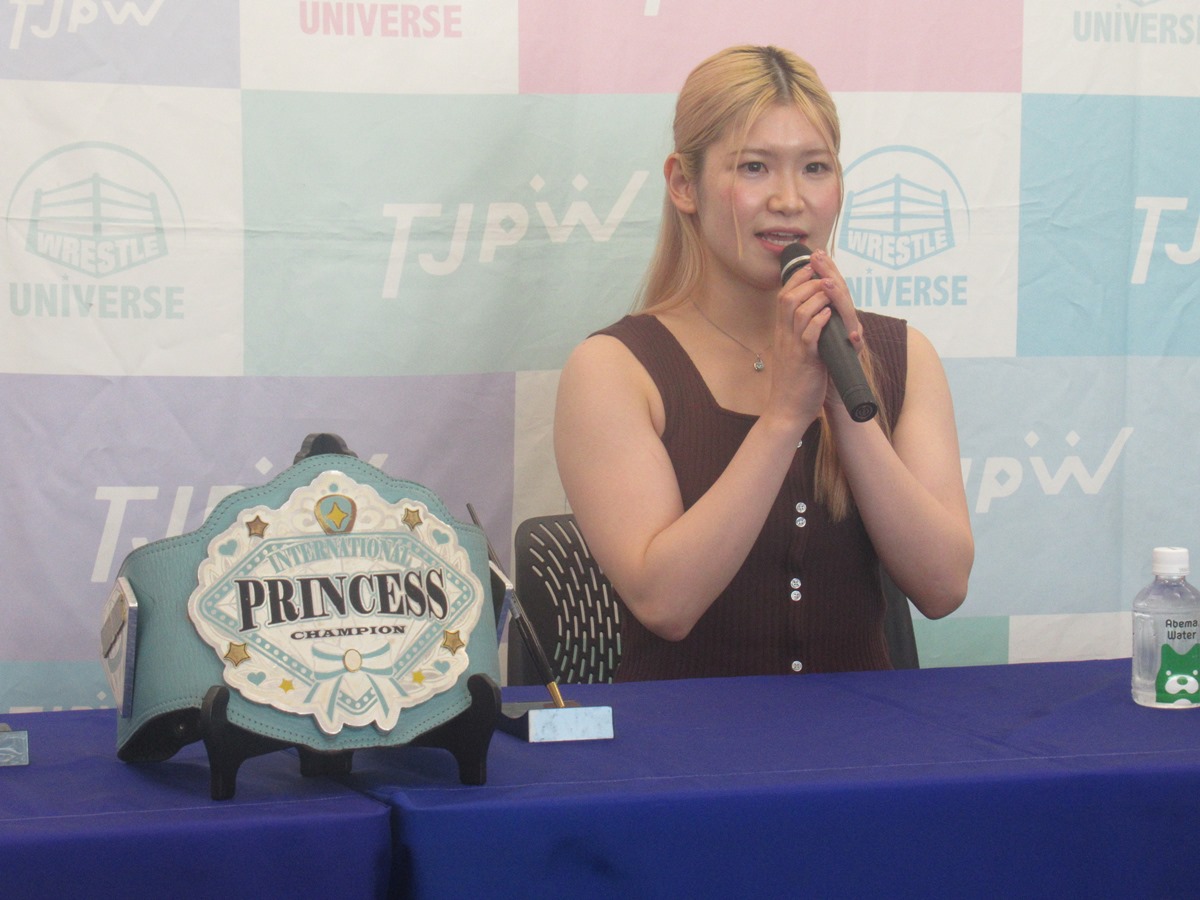 東京女子プロレスが6月19日、東京・渋谷区のAbemaTowersで「SUMMER SUN PRINCESS ’25」(7月21日、東京・大田区総合体育館)に向け、タイトルマッチ調印式を開催した。インターナショナル・プリンセス(IP)王者の鈴芽が宮本もかとのV6戦に自信を見せた。