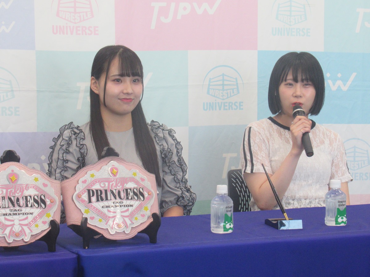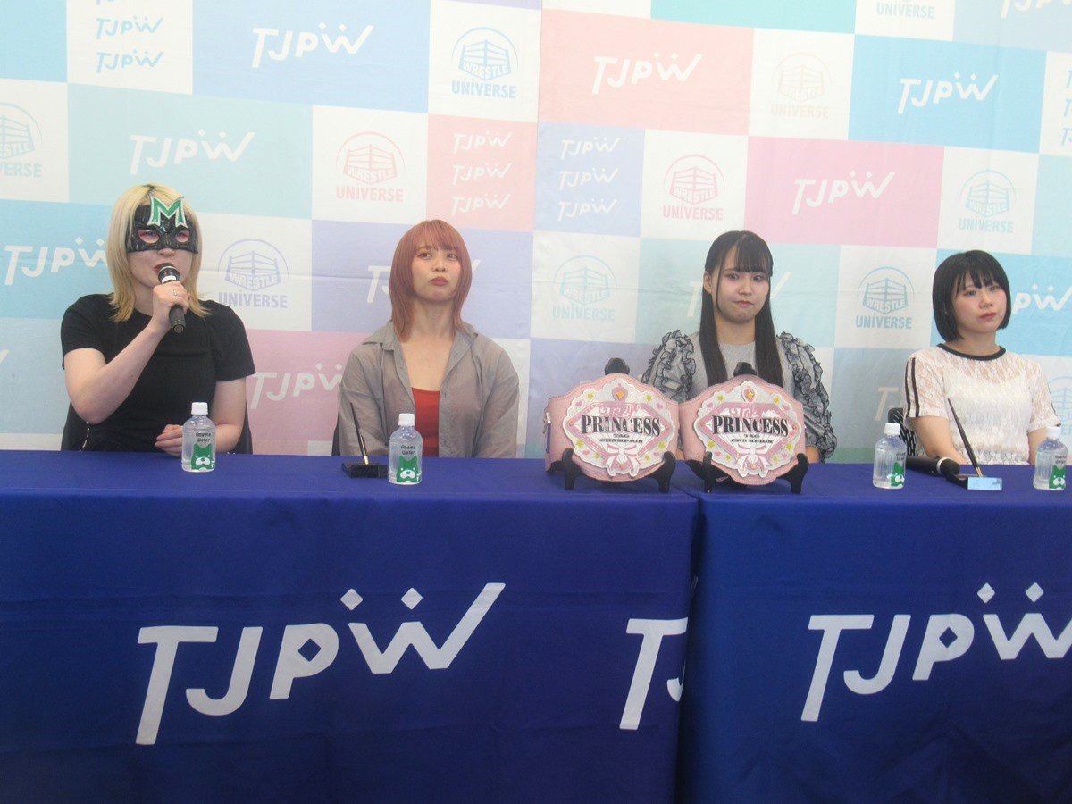 東京女子プロレスが6月19日、東京・渋谷区のAbemaTowersで「SUMMER SUN PRINCESS ’25」(7月21日、東京・大田区総合体育館)に向け、タイトルマッチ調印式を開催した。約1年ぶりに復活した白昼夢(辰巳リカ&渡辺未詩)の挑戦を受ける、プリンセスタッグ王者組の享楽共鳴(中島翔子&ハイパーミサヲ)がベルト死守を宣言した。