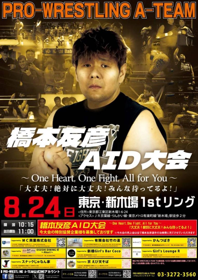 この事態に、同団体の所属全選手、全スタッフが一致団結。“兄貴分”橋本を救うべく、「橋本友彦AID大会」の開催を決めた。全選手がノーギャラで参加し、この大会の興行収入から必要経費を差し引いた全額が治療費として、橋本に贈られる。