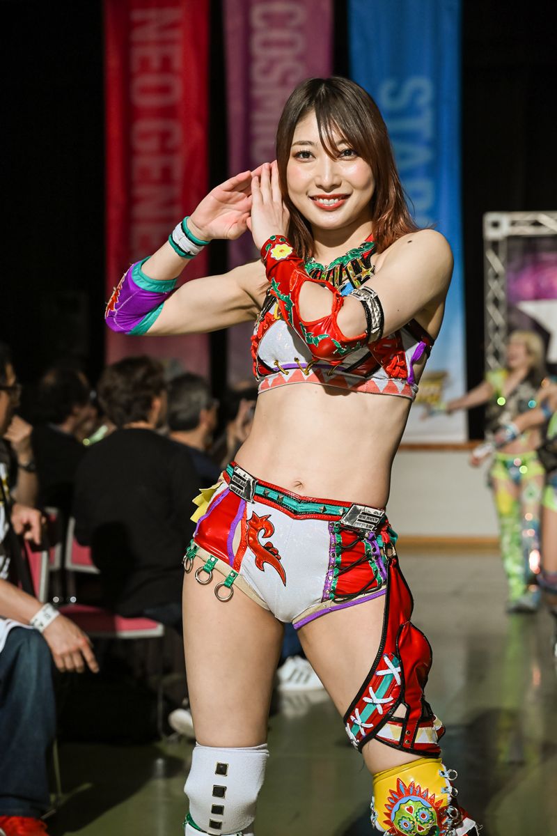 「自分もプロレスやってるけど、私から見たスターダムはブロードウェイなんですよ。雲の上の存在という感じです。私のやってるものとは別物だし、ただのファン、エンターテインメントとして純粋に楽しんでいました。実際、私にも推しが何人かおりまして(笑)。当時の推しは、岩谷麻優、鹿島沙希、スターライト・キッド、上谷沙弥。あと、中野たむ選手の受けがすごく好きで、よく見させていただいておりました」