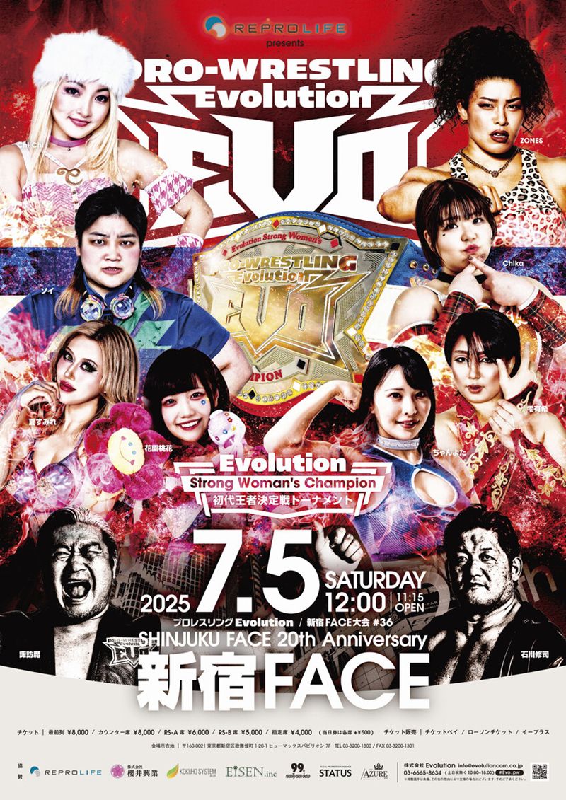 プロレスリングEvolutionが、7月5日(土)に開催する『株式会社リプロライフpresents 7.5 プロレスリングEvolution 新宿FACE大会 #36 ~SHINJUKU FACE 20th Anniversary~』の全対戦カードを発表した。