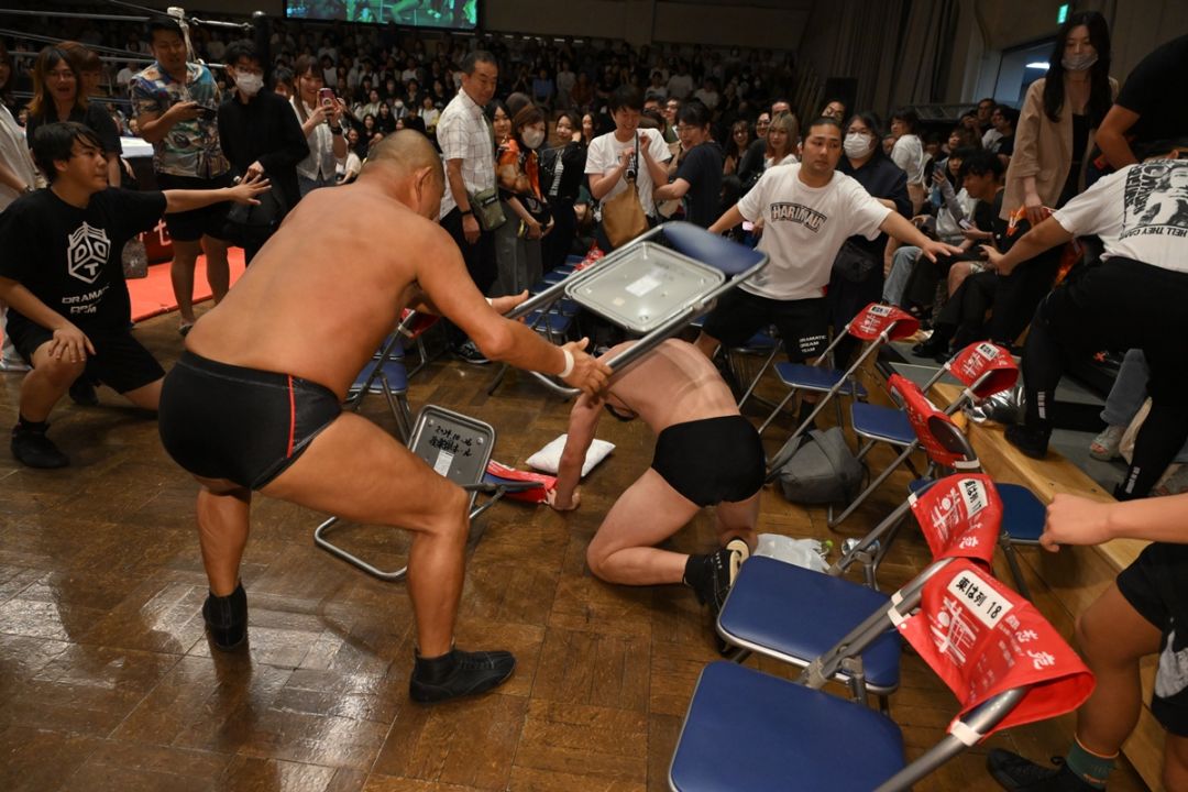 第5試合で鈴木は上野勇希と組み、青木&高鹿佑也と激突。鈴木と青木はピリピリするようなレスリングの攻防の後、場外戦となりエルボーの打ち合い、鈴木がイスで殴打。