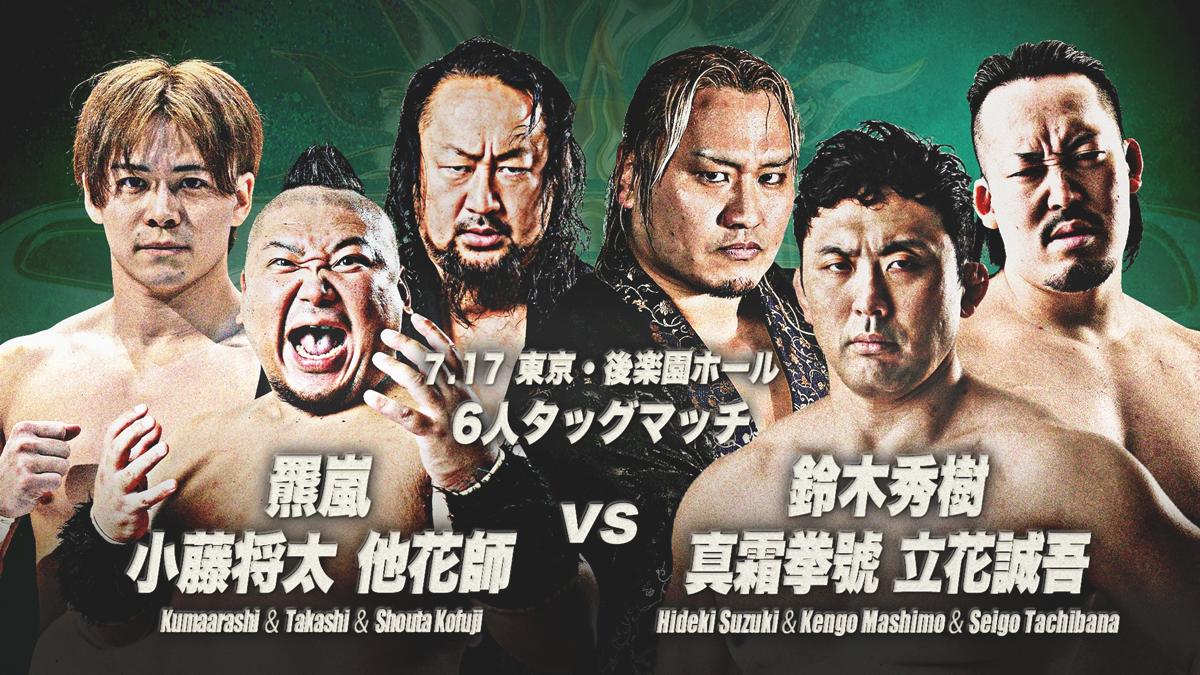 もう一方は三冠ヘビー級選手権を巡る前哨戦。7月21日の三冠戦に向け、本田竜輝がデイビーボーイ・スミスJr.、芦野祥太郎、綾部蓮を伴って、王者・斉藤ジュン、斉藤レイ、MUSASHI、宮本裕向の異色合体チームに挑む。王座戦へ向け、火花散る一戦となることは必至だ。