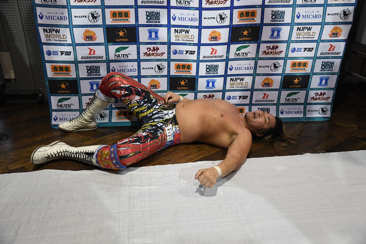 一方、惜しくも敗れた棚橋は、村島トレーナーに支えられながら現れ、そのまま床に大の字となった。