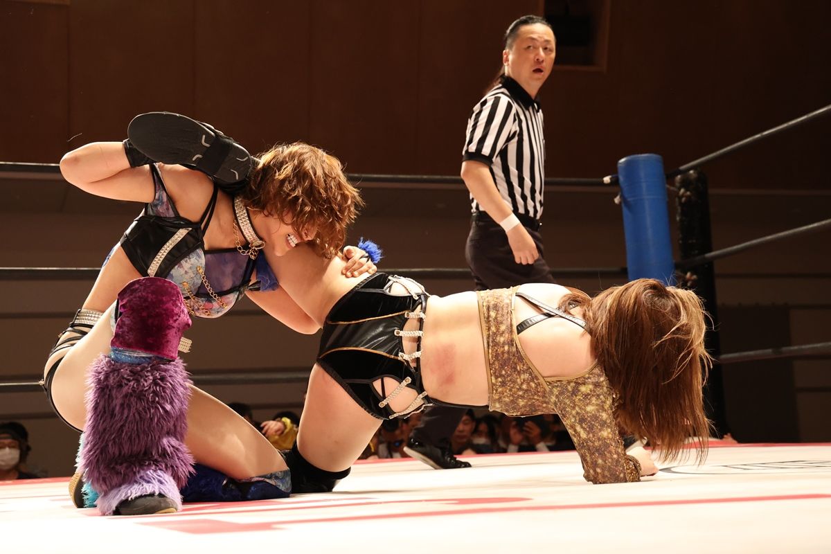 リアラが低空ドロップキック、フットスタンプを繰り出せば、長谷川はエルボー、クロスボディで応戦。長谷川がクロスボディからマフラーホールドで締め上げると、HIMAWARIがカット。鳥喰がHIMAWARIを場外に排除し、リング上は長谷川とリアラの1対1に。