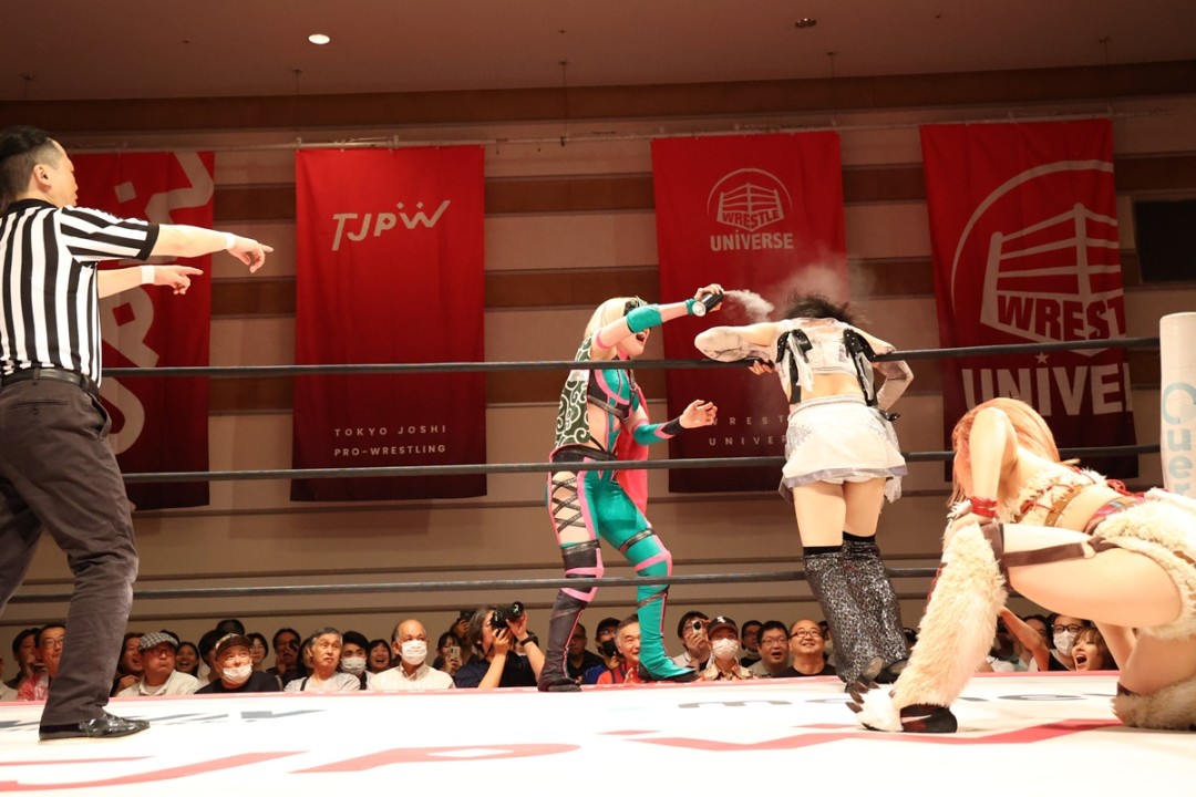 開始早々、辰巳が中島の首を絞めると、ミサヲがスプレー噴射で反撃。中島がトペを狙うと、渡辺が場外でさすまたで威嚇して阻止。中島と辰巳がさすまたを手にするとチャンバラに発展。
