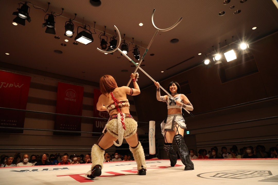 今大会のメインイベントでは7・21大田区で行なわれる3大タイトルマッチ(プリプリ王座戦&プリンセスタッグ王座戦&インターナショナル・プリンセス王座戦)のトリプル前哨戦として、王者チームの瑞希&中島翔子&ハイパーミサヲ&鈴芽が挑戦者チームの荒井&辰巳リカ&渡辺未詩&宮本もかと8人タッグマッチで激突。白昼夢(辰巳&渡辺)の2人は、この日もさすまたを手に登場した。