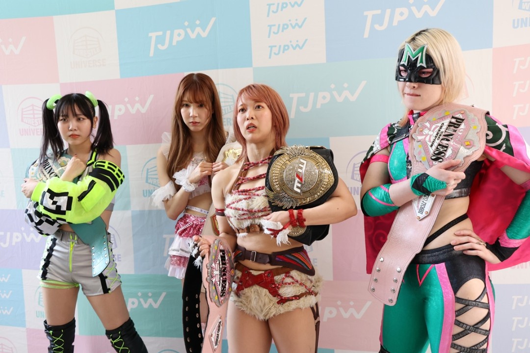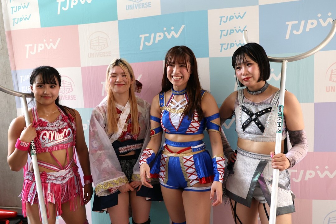 享楽共鳴(中島&ミサヲ)の持つプリンセスタッグ王座に白昼夢で挑戦する辰巳は「やっぱり夏は白昼夢なんですよ。夏女なので、このままタッグでも5年ぶりのチャンピオンになって、さすまたを広めて。修行に行って、そのまま大田区に行くんで、みんな期待しててください」と意気込んだ。鈴芽の保持するインター王座に挑む宮本は「チャレンジャーチームで勝つことができて、力がみなぎりました。米国でも前哨戦で鈴芽さんと戦いますし、大田区までに自分が100%の状態にもっていけるように、突っ走っていきたいと思います」と意欲を見せた。