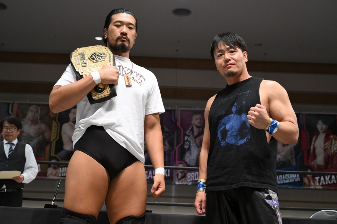 王者・樋口は「ちょうど10年前、DNAでデビューして半年で、KO-Dに挑戦しました。札幌テイセンホール。そこで自分は当時のチャンピオンHARASHIMAさんに完膚なきまで叩きのめされました。それこそ強さを見せられた。そんな感じがありました。その後もKO-D戦、もう1回後楽園でやりましたが負け。自分はKO-D無差別級戦でHARASHIMAさんに勝ったことがないんです。その後は何回か勝ったことがありますけど、このベルトを懸けたとき、最後勝ち名乗りを受けたのはHARASHIMAさんでした。自分としてはリベンジだと思ってます。全力でいかしていただきます」とチャレンジャーの姿勢で臨む意向を示した。