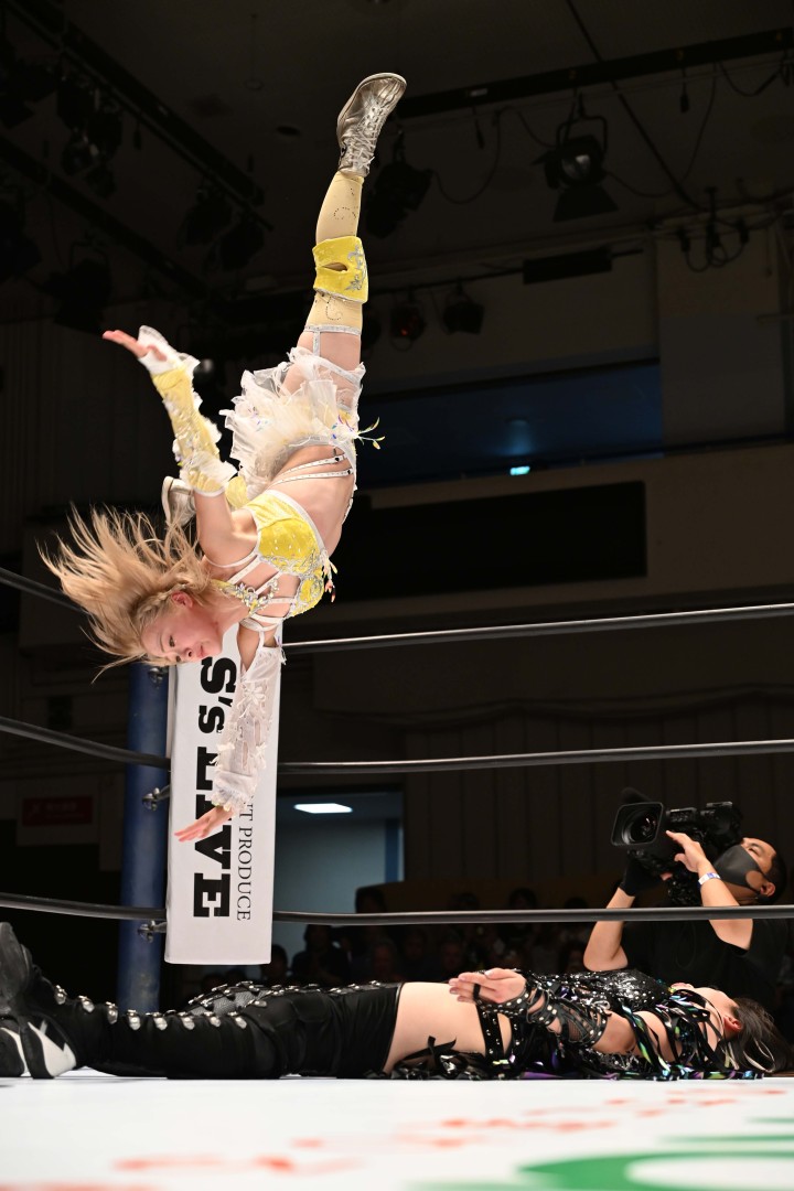 ここで琉悪夏がマイクを持つと「wing☆gori(羽南&飯田)、このゴッデス戦は私のやりたい日にやる。7月24日、ここ後楽園ホールで決定だ!」と刀羅をパートナーに挑戦をアピール。飯田は「わがままだな!いいよ、受けて立つ。7・24後楽園でゴッデス、しっかり防衛する。H.A.T.E.の好きなようにはさせない!」と受諾し、羽南&飯田vs刀羅&琉悪夏のゴッデス・オブ・スターダム戦が決定的に。