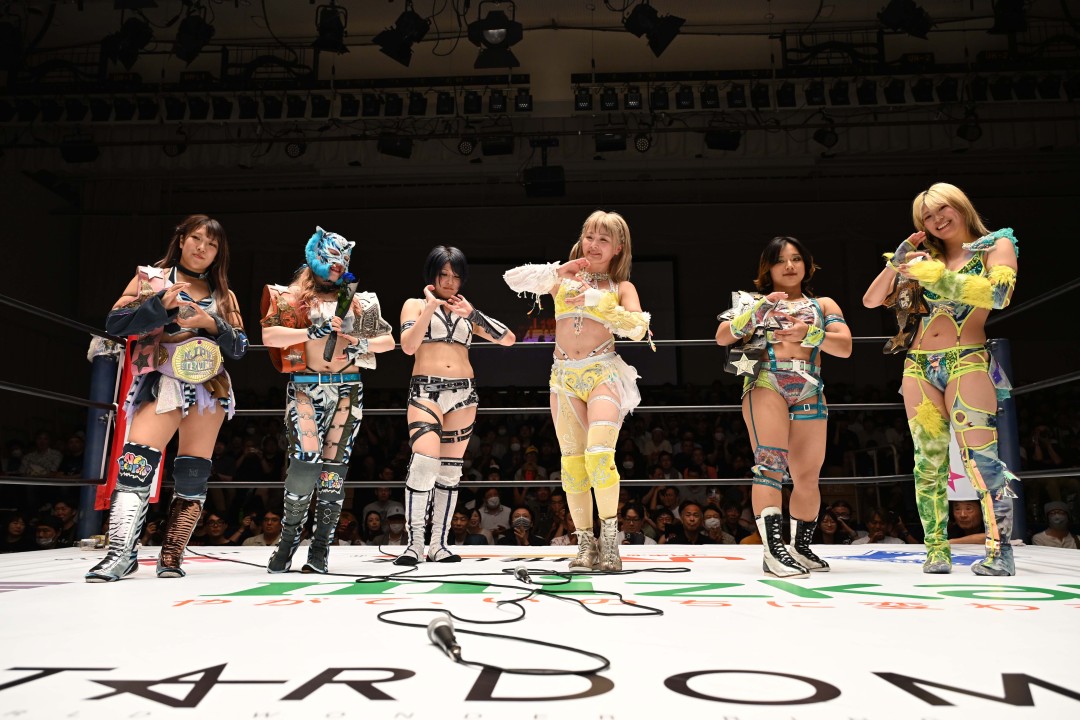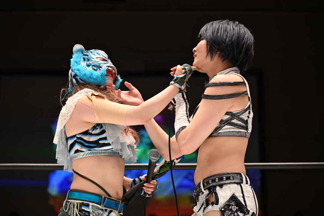 ここで琉悪夏がマイクを持つと「wing☆gori(羽南&飯田)、このゴッデス戦は私のやりたい日にやる。7月24日、ここ後楽園ホールで決定だ!」と刀羅をパートナーに挑戦をアピール。飯田は「わがままだな!いいよ、受けて立つ。7・24後楽園でゴッデス、しっかり防衛する。H.A.T.E.の好きなようにはさせない!」と受諾し、羽南&飯田vs刀羅&琉悪夏のゴッデス・オブ・スターダム戦が決定的に。