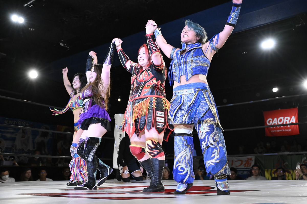 セミファイナルでは、“ゴジゾネス連合”同士の内部対決が実現。松本浩代がZONESと一騎打ちを展開した。全身全霊でぶつかり合った末、松本が13分30秒、強烈な“顔壊(がんかい)”でZONESをギブアップに追い込み勝利を収めた。この勝利により、松本&ZONES組は8月17日後楽園大会でタッグ王座に挑戦。さらに、このタイトルマッチの勝者に対し、青木いつ希&水波綾の【チームパワースポット】が、8月24日の豊田合成記念体育館大会で挑戦することが発表された。