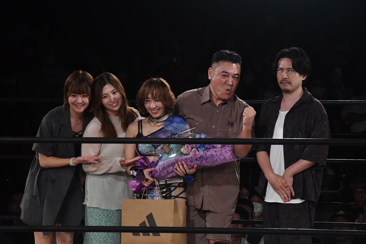 その後、リング上では引退セレモニーが行われた。アクトレスガールズ時代の仲間や、デビュー戦の相手であった藤本つかさが登場。さらには、芸能界からも有田哲平や山崎弘也、ピスタチオの伊地知大樹らが花束を贈った。