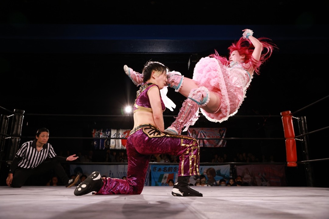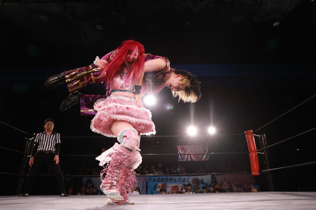愛梨紗は美央に武藤敬司公認シャイニング・ウィザードをぶち込むも、真琴がレフェリーの足を引っ張って阻止。美央が愛梨紗にグーパンチを見舞うも、耐えた愛梨紗はラリアットからちあふる☆ほいっぷを決めて殊勲の3カウントを奪取した。