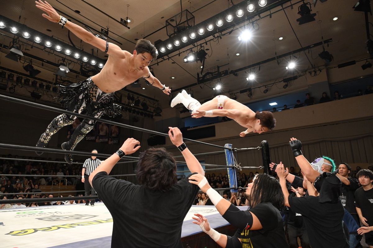 さらに、トップロープからの攻撃を試みた佐々木をドロップキックで撃墜させた。そして、武知と上野がダブルでトップロープ超えプランチャを発射。