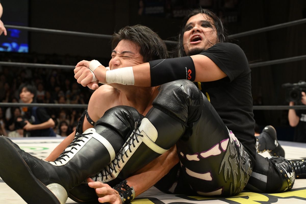 佐々木がダイビング・エルボードロップ、クロス・フェースロックで締め上げるも、耐えた武知は佐々木に打点の高いドロップキック。