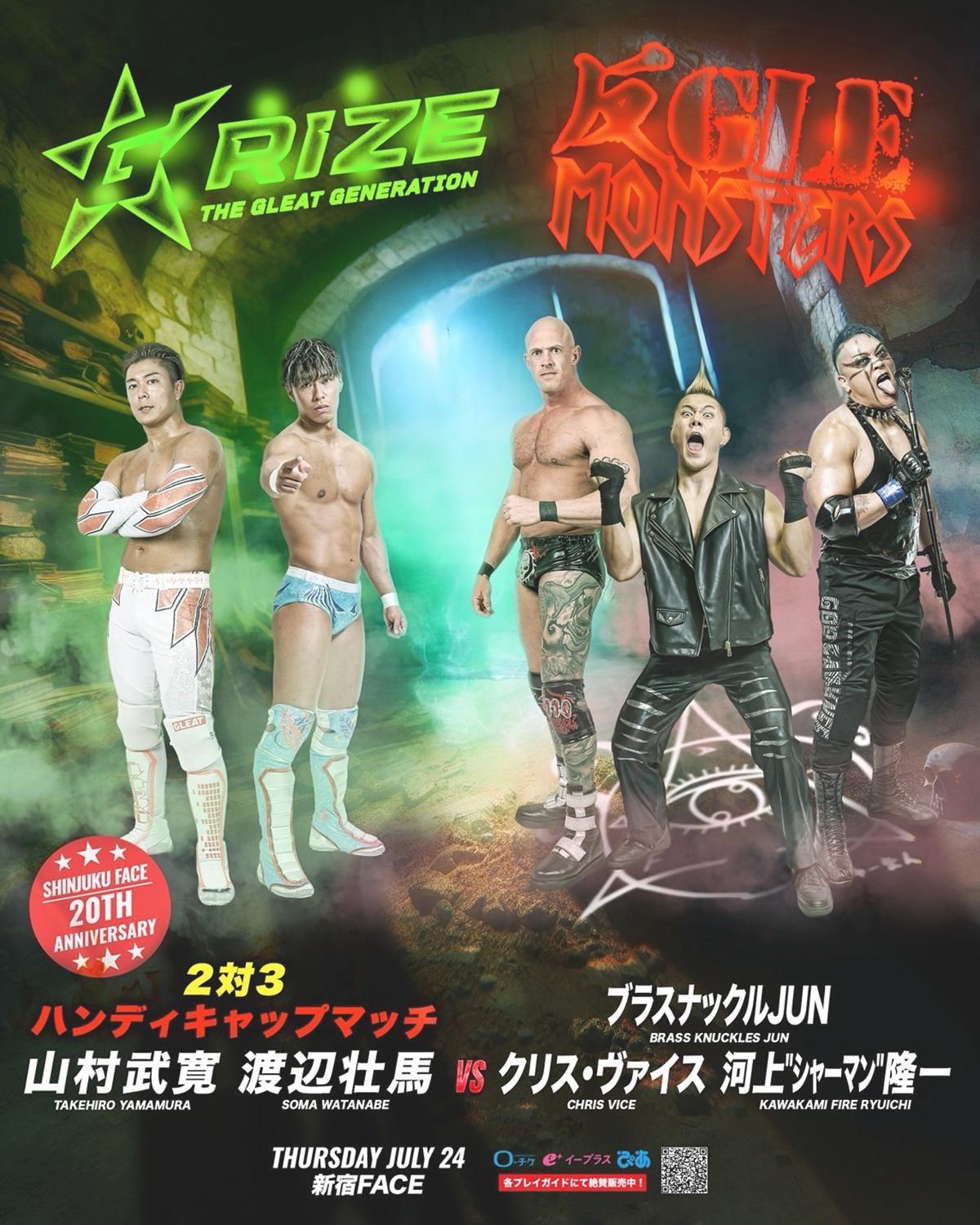 メインイベントでは G-RIZE 山村武寛 & 渡辺壮馬 vs 反 GLE MONSTERS、河上”シャーマン”隆一 & クリス・ヴァイス & ブラスナックル JUN の 2 vs 3 ハンディキャップマッチが決定。
