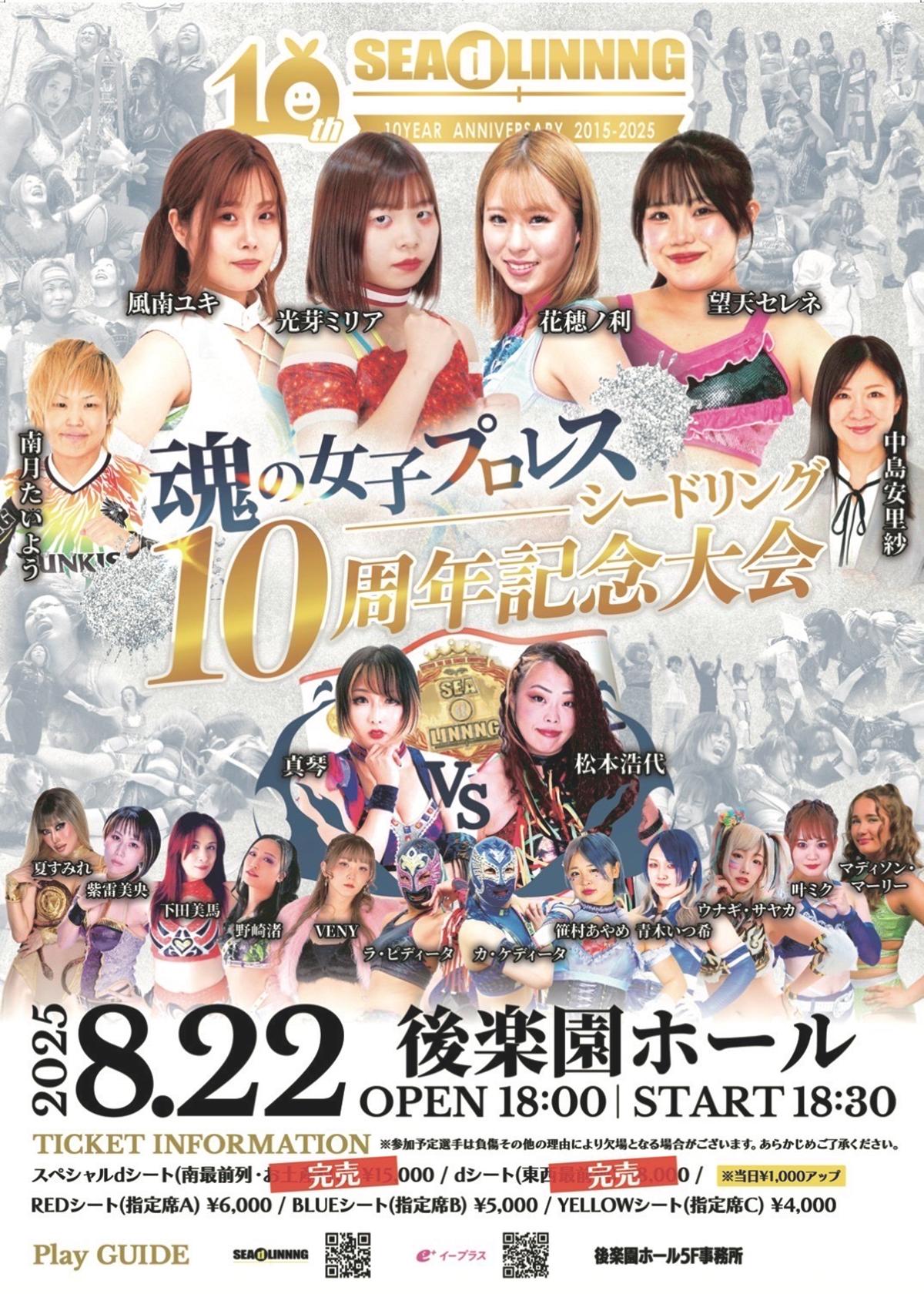 女子プロレス団体SEAdLINNNGは、創立10周年を記念するビッグイベント「SEAdLINNNG〜10周年記念大会〜」を、8月22日(金)に東京・後楽園ホールで開催すると発表した。メインイベントでは、現BEYOND THE SEAシングル王者・真琴が松本浩代を相手に初防衛戦に臨む。