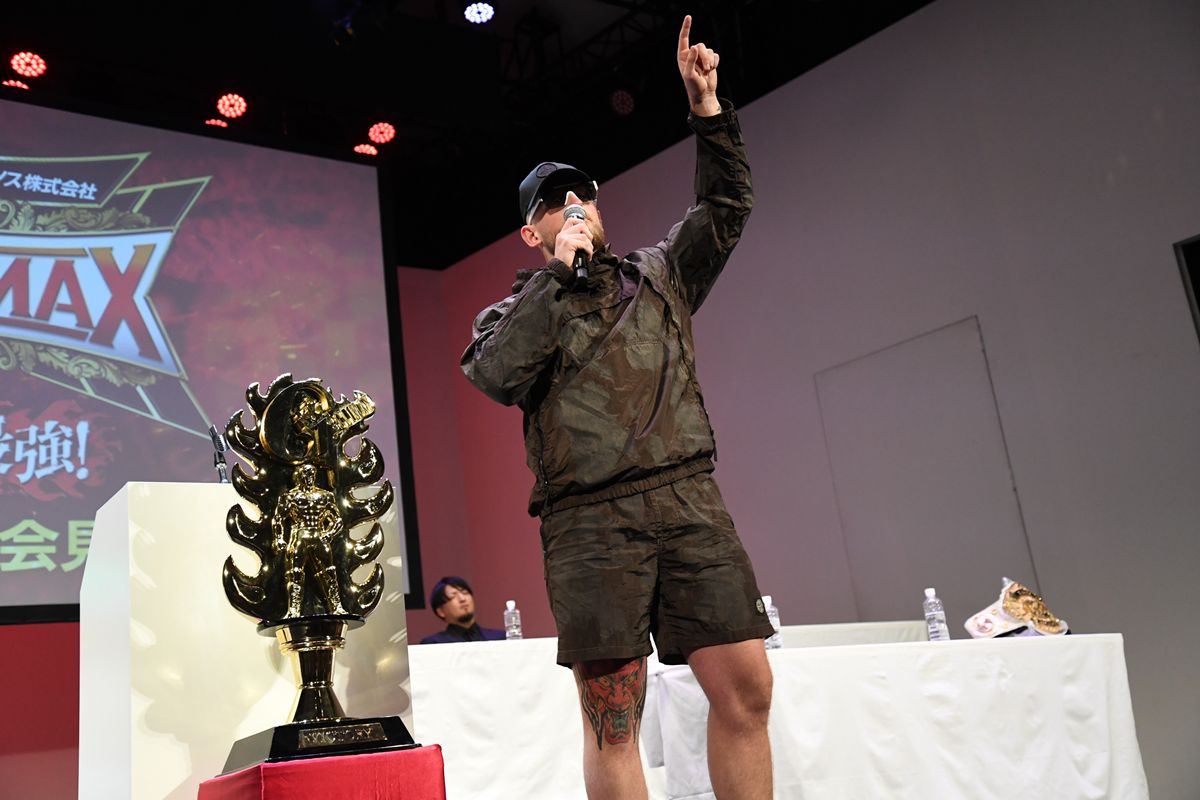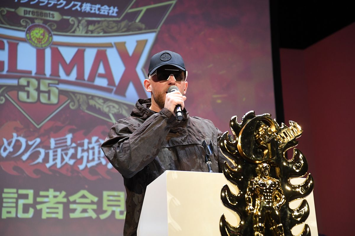 「しかも、今年の自分はIWGP GLOBALヘビー級チャンピオンとして、このトーナメントに出場することになった。すべてはよく考えれば単純なもので、自分自身はチャンピオンだからアメリカ国内だけでなく、世界中を旅してどんな試合をしても、周りにはチャンピオンばかり。その中で自分は研ぎ澄まされてきている。この『G1』、ブロック関係なく、そして誰であれ自分の前に立ちはだかる者には、自分のさらにレベルアップした獰猛さを見せていきたいと思う。対戦した相手すべて、コテンパンにしてやる!」