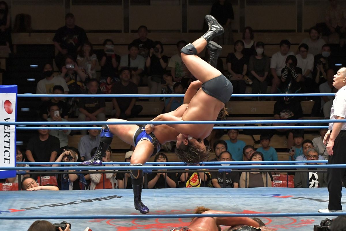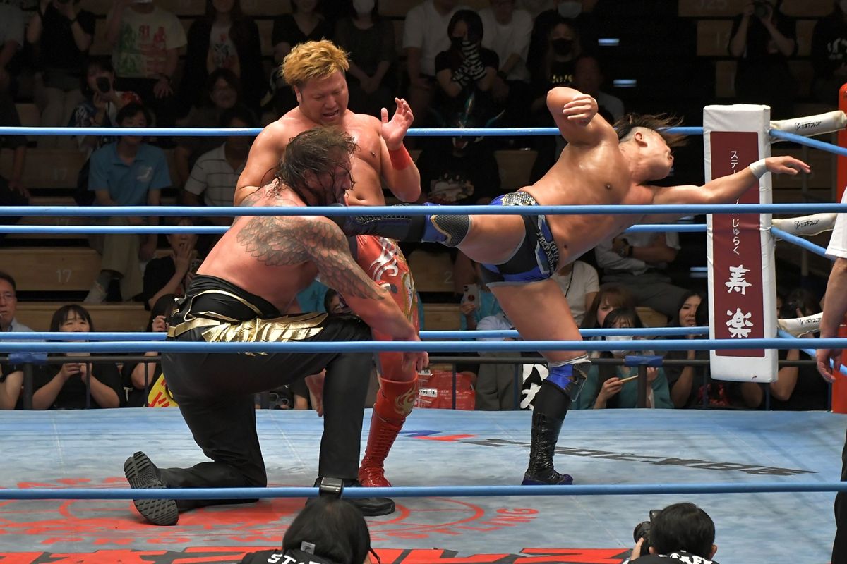 7月17日、東京・後楽園ホールで開催された「サマーアクションシリーズ2025」で、世界タッグ王者の宮原健斗&青柳優馬組が大森北斗&タロースの北斗軍を退け、王座3度目の防衛に成功。