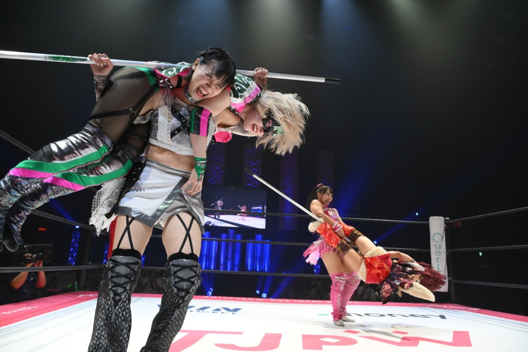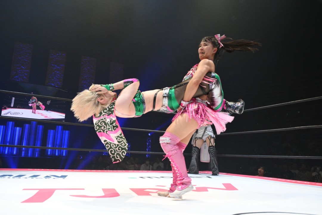 東京女子プロレスが7月21日、東京・大田区総合体育館で夏のビッグマッチ「SUMMER SUN PRINCESS ’25」を開催した。プリンセスタッグ王者組の享楽共鳴(中島翔子&ハイパーミサヲ)がライバルチーム白昼夢(辰巳リカ&渡辺未詩)との大激闘を制して、3度目の防衛に成功した。