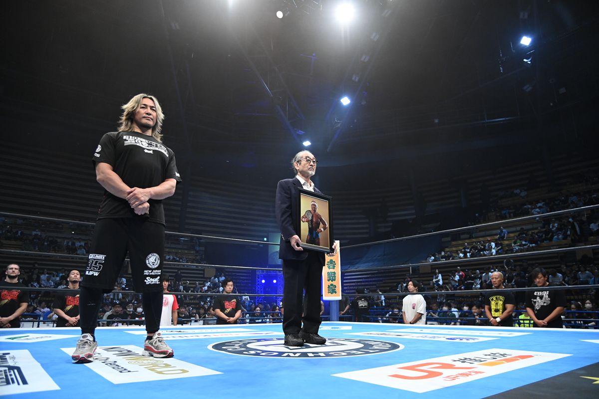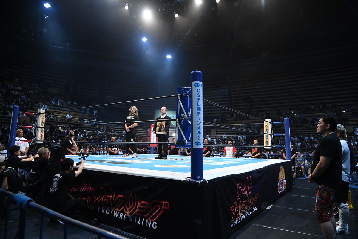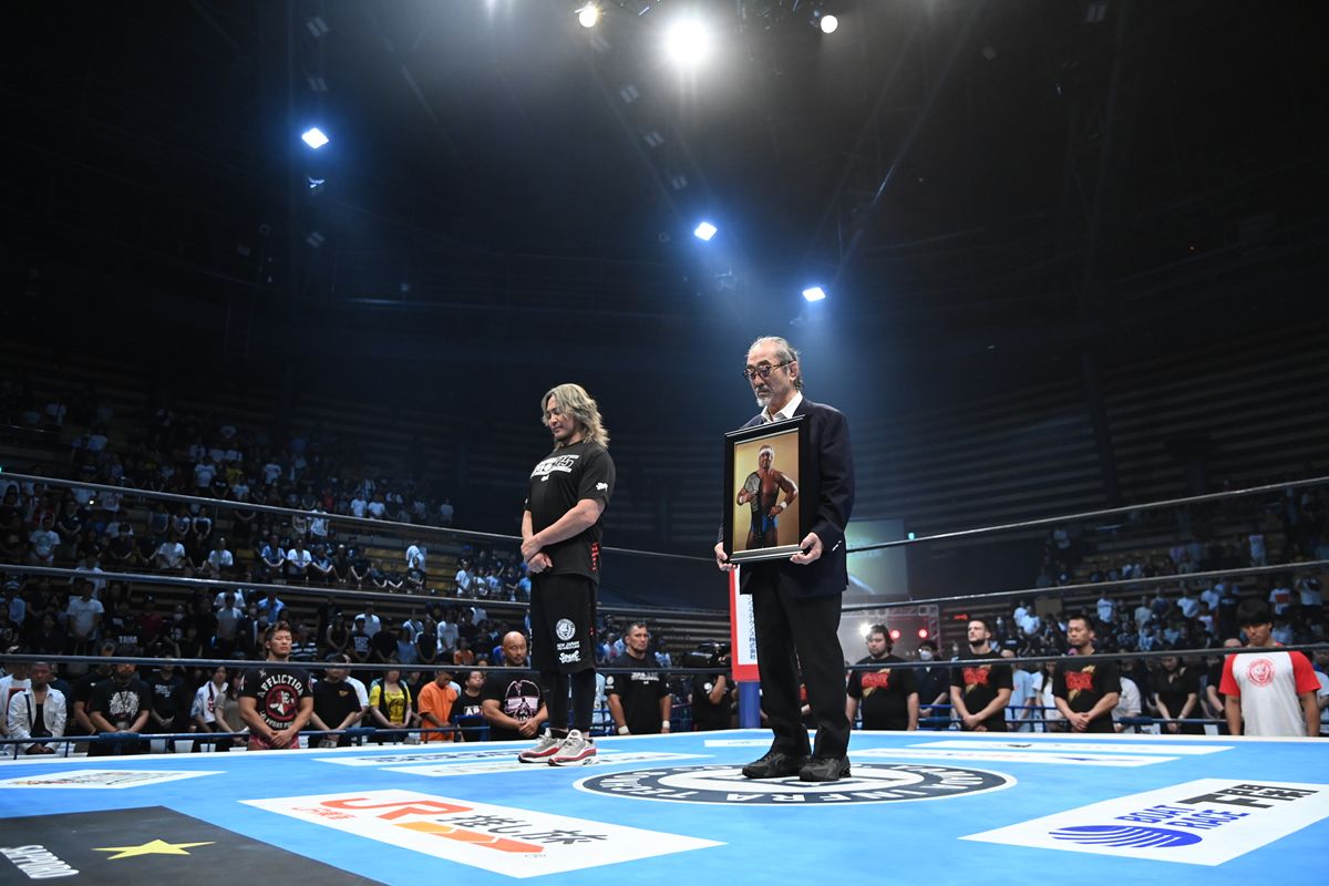 リングには、新日本プロレスの棚橋弘至社長、そしてホーガンさんと深い親交のあったレフェリーのタイガー服部さんが、ホーガンさんの遺影を胸に上がった。