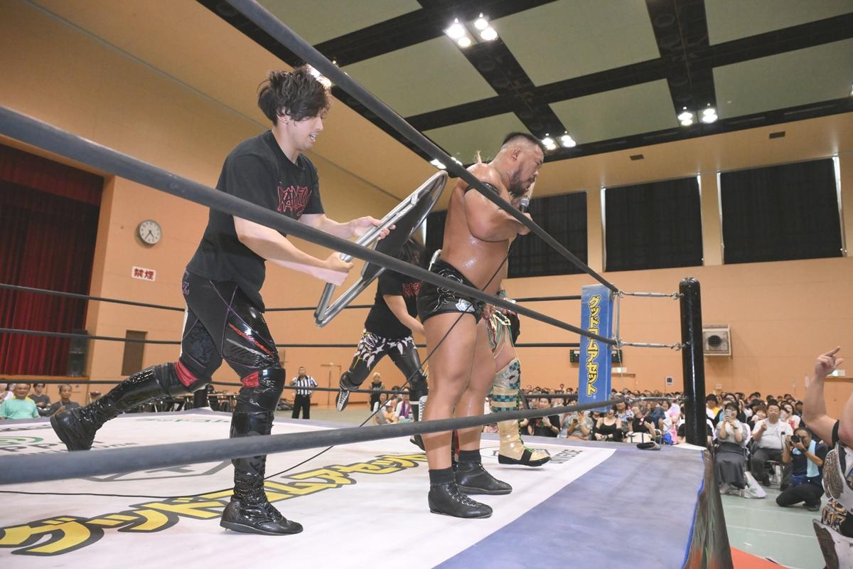悶絶する王者組に対し、佐々木は「The Apex、次の挑戦者は俺たち、ダムネーションT.A。てめえらに興味はねぇ。興味あるのはこのベルトだ。岡谷は飢えてんだよ!」、岡谷は「おまえらじゃ、このベルト腐らすだけ。おまえらにこのベルトはふさわしくない。本当の選ばし者を教えてやる」と挑戦表明。飯野が「正々堂々とおまえらを叩き潰してやるよ!」と受諾し、8・30ひがしんでの王座戦が決定した。