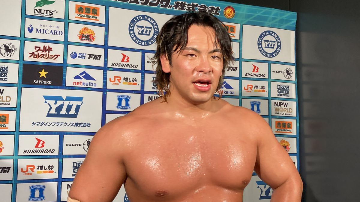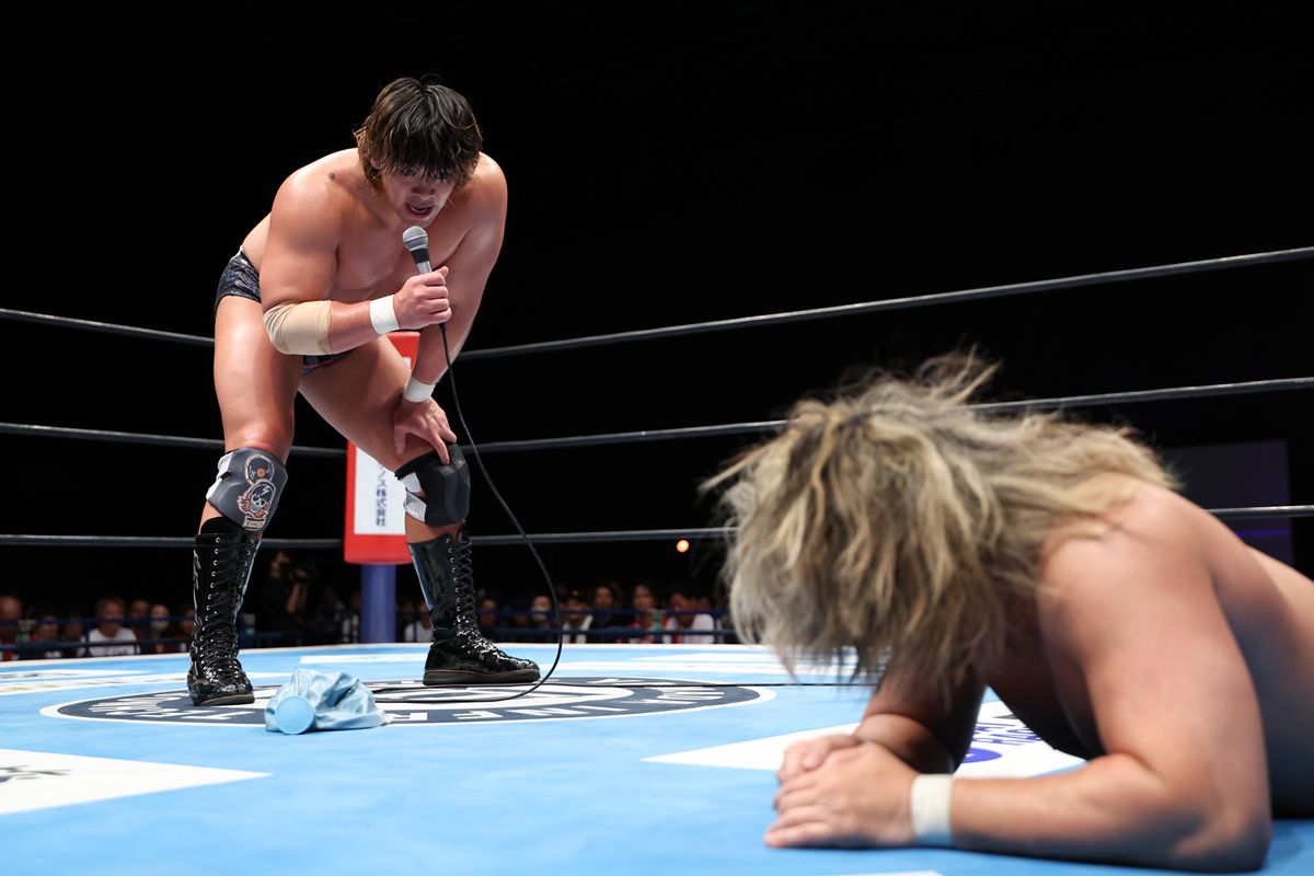 大岩「マジで最高。メインでこうやって勝って、マイクでみんなに気持ちを伝えて、これでこそプロレスラーだと思う。棚橋さんがこれまでの『G1』で99勝で、100勝を懸けた今日だったけど、俺が100勝目になるってのは一番許せなかったし、今日は何がなんでも。そして地元の愛知!愛知だからみんなのパワーを貰いました。みんなの声援が俺の力になった。だから俺のプロレスを観て、明日から頑張ろうとかそういうふうに思ってくれたら、俺はメッチャうれしいっす。次、『G1』公式戦、EVILか。俺がNOAHに行ったこととか、いろいろとバカにした記事を読んだぞ。今日とはまた違った闘い方で、お前を地獄に落としてやる」