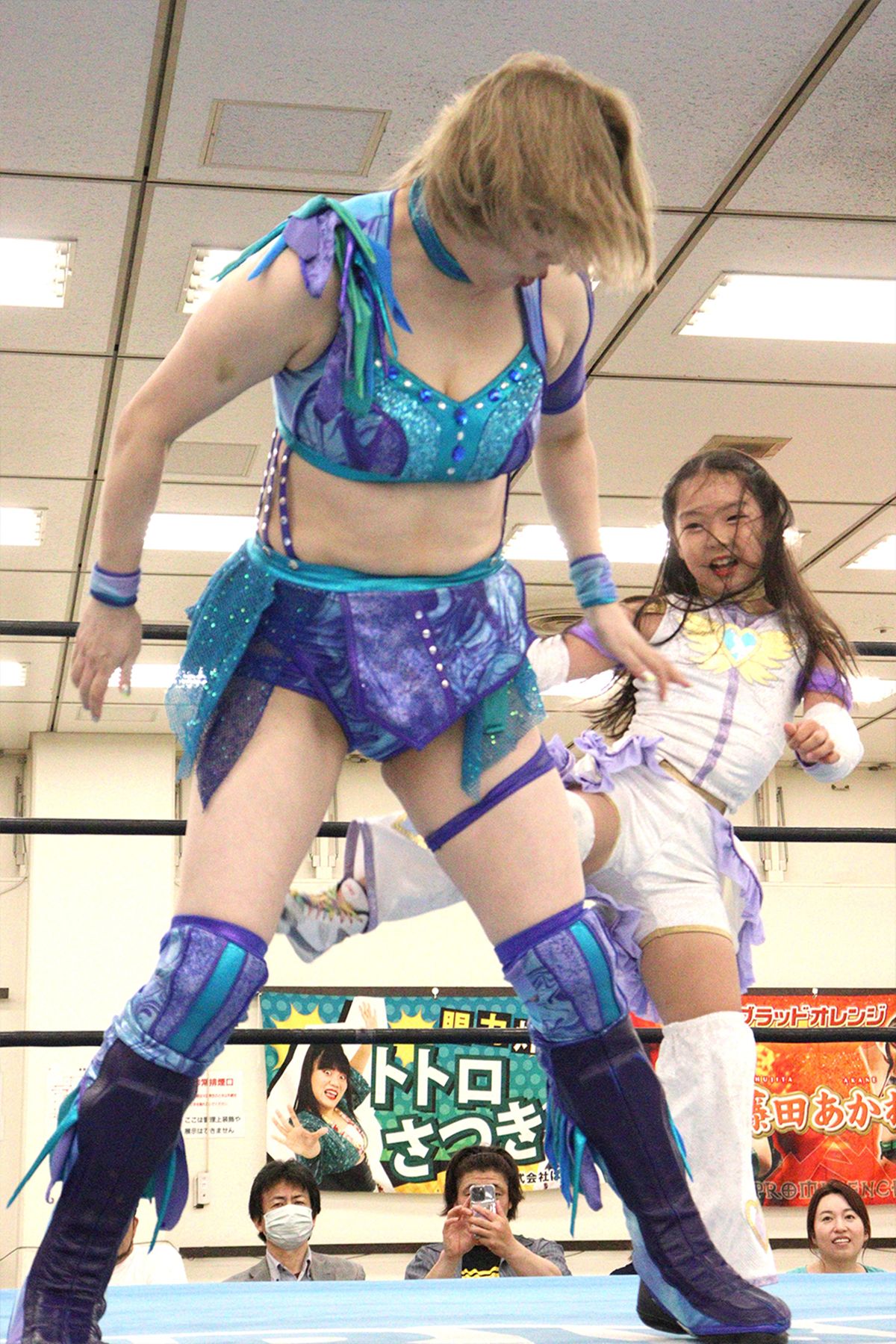 りこにとって今年デビューの同期でもあるhotシュシュ所属のもえとの初シングルマッチ。ロックアップからもえがロープに詰めるも、すぐにりこが半転。クリーンブレイクで分かれる。ロックアップから腕の取り合いへ。もえがアームホイップも、りこが丸め込みから低空ドロップキック。りこがボディスラムを狙うが、もえが逆にりこをボディスラムで投げカバーもカウント2。りこがドロップキック4連発でカバーもカウント2。