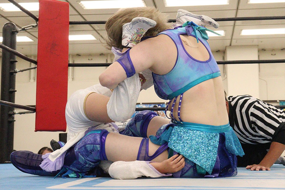 今回で折り返しを迎えたきらりの七番勝負。山下との一戦が横浜リボンのメインに組まれた。開始早々にいきなりきらりを吹っ飛ばす山下。さらに引き起こしてのヘッドロック。きらりがヘッドロックを取り返す。きらりがロープに飛ばされるもカウンターのドロップキック。しのいだ山下が再びヘッドロック。グランドに持ち込むもきらりがヘッドシザース。山下が逃れてにらみ合い。ロックアップできらりが必死に押すも山下が動かない。きらりをロープに詰める。半転したきらりがロープ越しでエルボー連打。