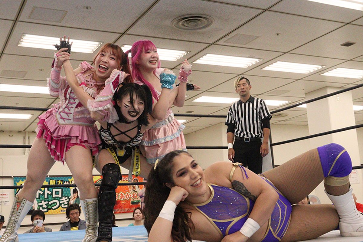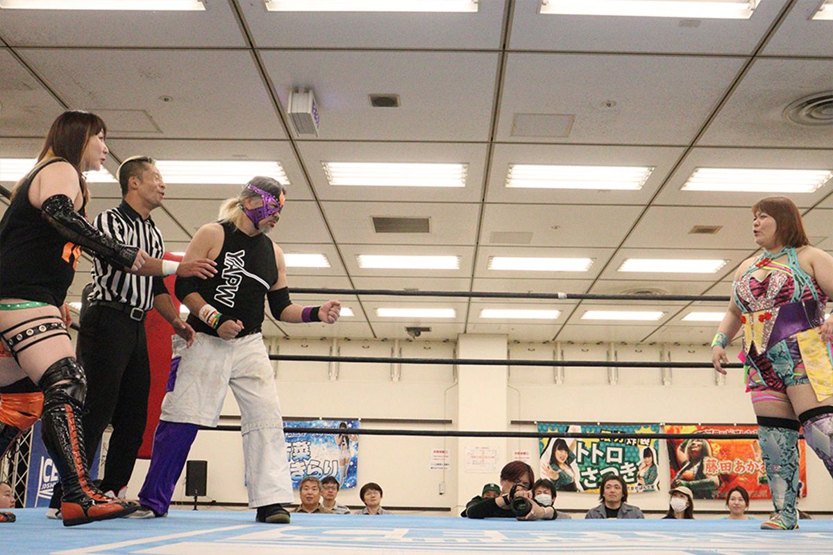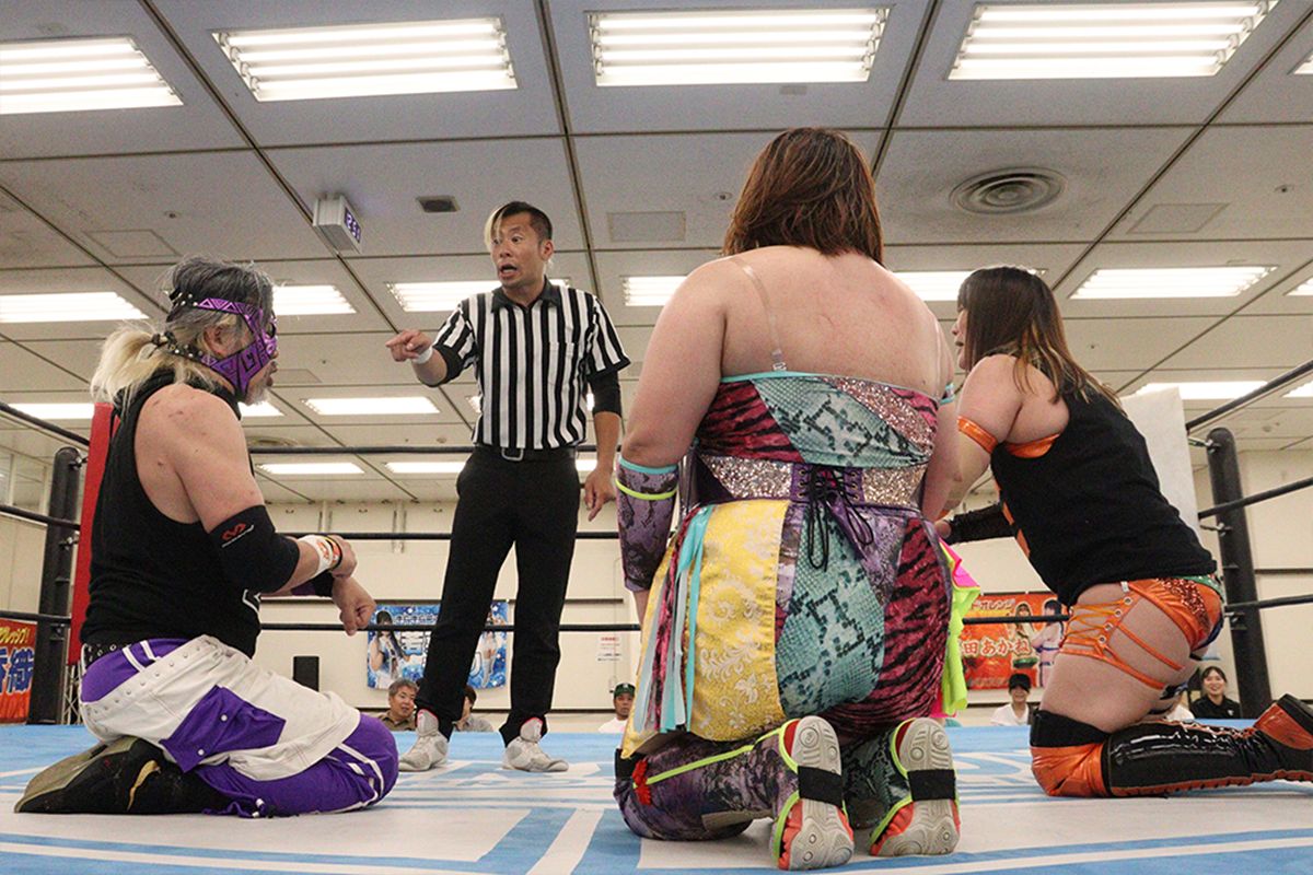 試合再開。レフェリーにクレームを入れるミノルの背後からトトロがスクールボーイもカウント2。あかねがトトロのバックを取ってのスクールボーイもカウント2。ミノルがあかね、トトロを同じコーナーに振り、そこにレフェリーを投げようとするが、トトロが飛び込みレフェリーと腕を組むとレフェリーをコーナーのミノルに投げる。レフェリーがミノルにラリアットを入れトトロとハイタッチ。トトロがあかねにタックル、ボディプレスでカバーもカウント2。あかねがトトロにヘッドバットを決め丸め込みもカウントは2。