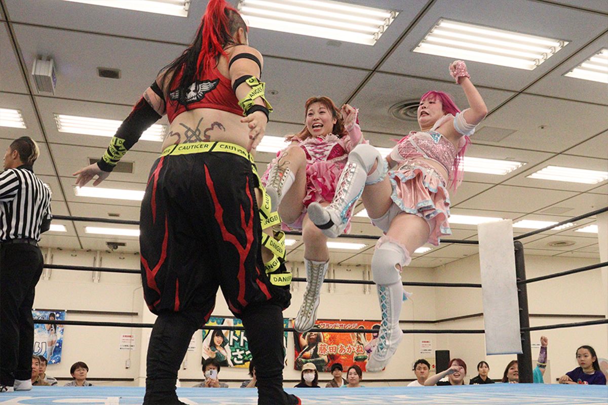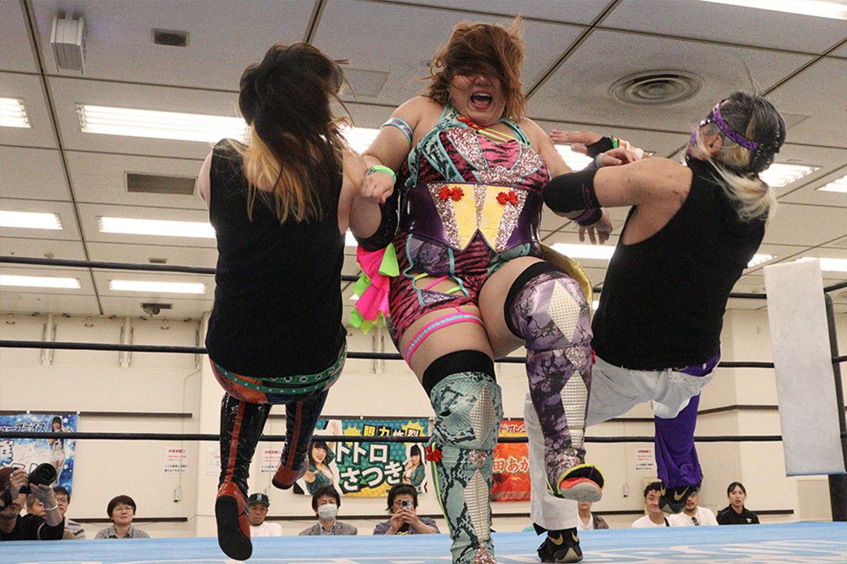 さすがにこれはトトロからクレームが入る。3人で力比べもトトロが2人を押し潰す。ダブル藤田がサイドに回ってトトロの腕を同時に絞め上げる。あかねがトトロにヘッドロック。ミノルがトトロの足を決めにいくがうまく取れず、あかねにヘッドロックを決める。逃れたトトロがミノルにヘッドロック。ミノルが逃れ、トトロの背中にあかねがダブルチョップ。あかね、ミノルの順にトトロにタックルもトトロが倒れない。ダブル藤田が2人でトトロをロープに振るが、トトロが2人まとめてタックルで吹っ飛ばす。