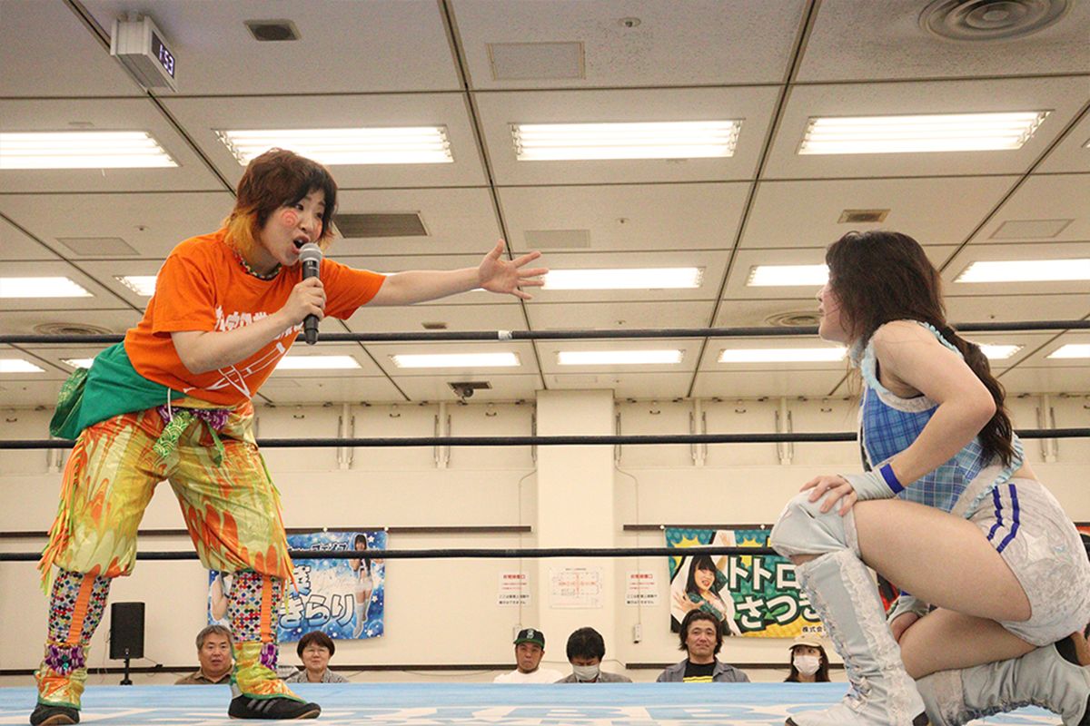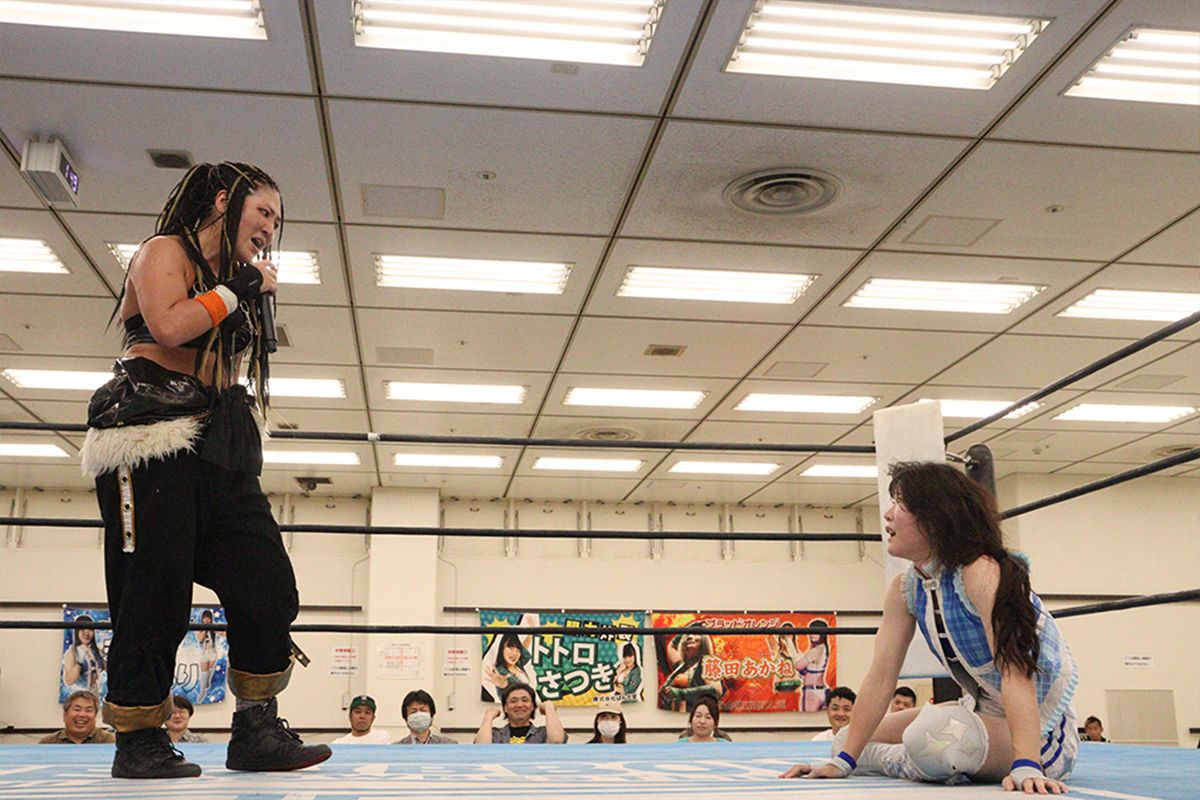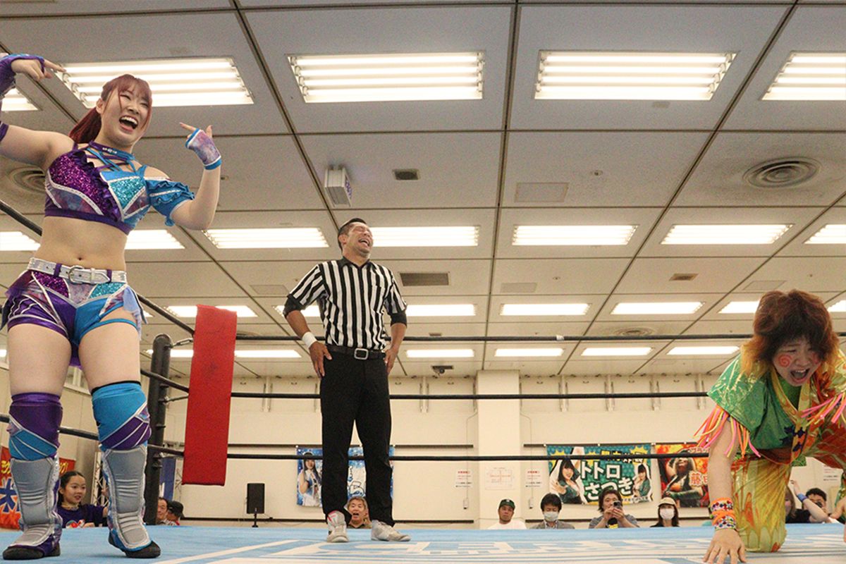 7月21日の北沢大会での王座戦では度重なる妨害により敗れるも、試合後、すぐにミノルに再戦を要求したトトロ。そしてもう1人の挑戦者として名乗りを挙げたのが、あかね。かつてはダブル藤田でタッグも組んでいたあかねの挑戦に“味方”と受け取ったミノルが再戦を了承。前回のタイトル戦からわずか5日のインターバルでタイトル戦が組まれることになった。試合前に握手を交わしたミノルとあかねのダブル藤田が2人でトトロに向かい合う。さらにレフェリーを引き込むと3人でトトロに向かい合う。